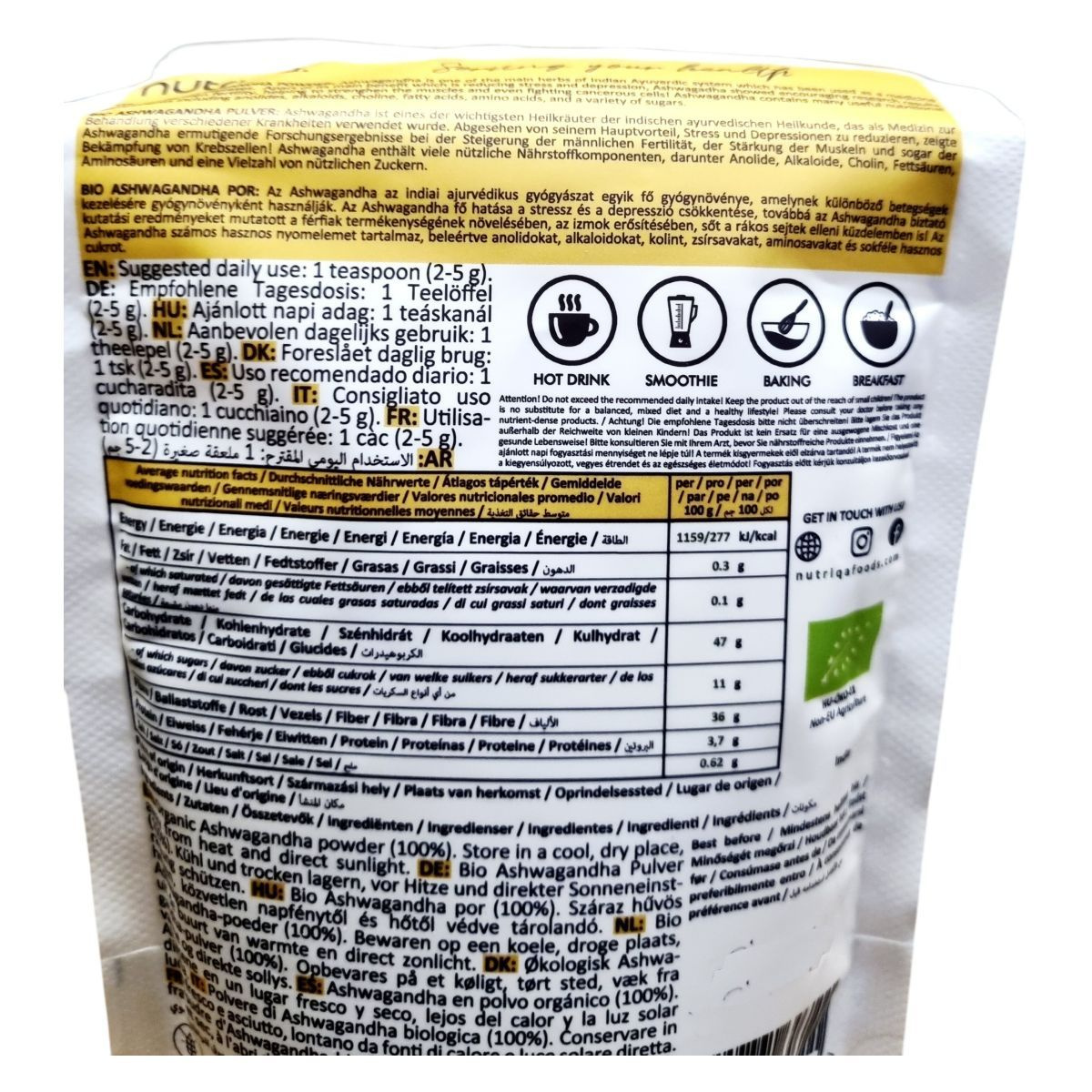 Az Organic Ashwagandha Powder a nutriqa márkától egy 100% bio, vegán, raw és ayurvédikus étrend-kiegészítő, amely az indiai ayurvédikus gyógyászat egyik fő gyógynövényét, az Ashwagandhát tartalmazza. Az Ashwagandha számos hasznos nyomelemet tartalmaz, mint például anolidokat, alkaloidokat, kolint, zsírsavakat, aminosavakat és különféle cukrokat. A termék GMO-mentes, gluténmentes, laktózmentes, szójamentes, és nem tartalmaz hozzáadott cukrot. Az Ashwagandha hozzájárulhat a stressz és a depresszió csökkentéséhez, valamint támogathatja a férfiak termékenységét, az izmok erősítését és a rákos sejtek elleni küzdelmet. Az ajánlott napi adag 1 teáskanál (2-5 g), amelyet különböző formákban, például forró italokban, turmixokban, sütéshez vagy reggelihez lehet felhasználni.
