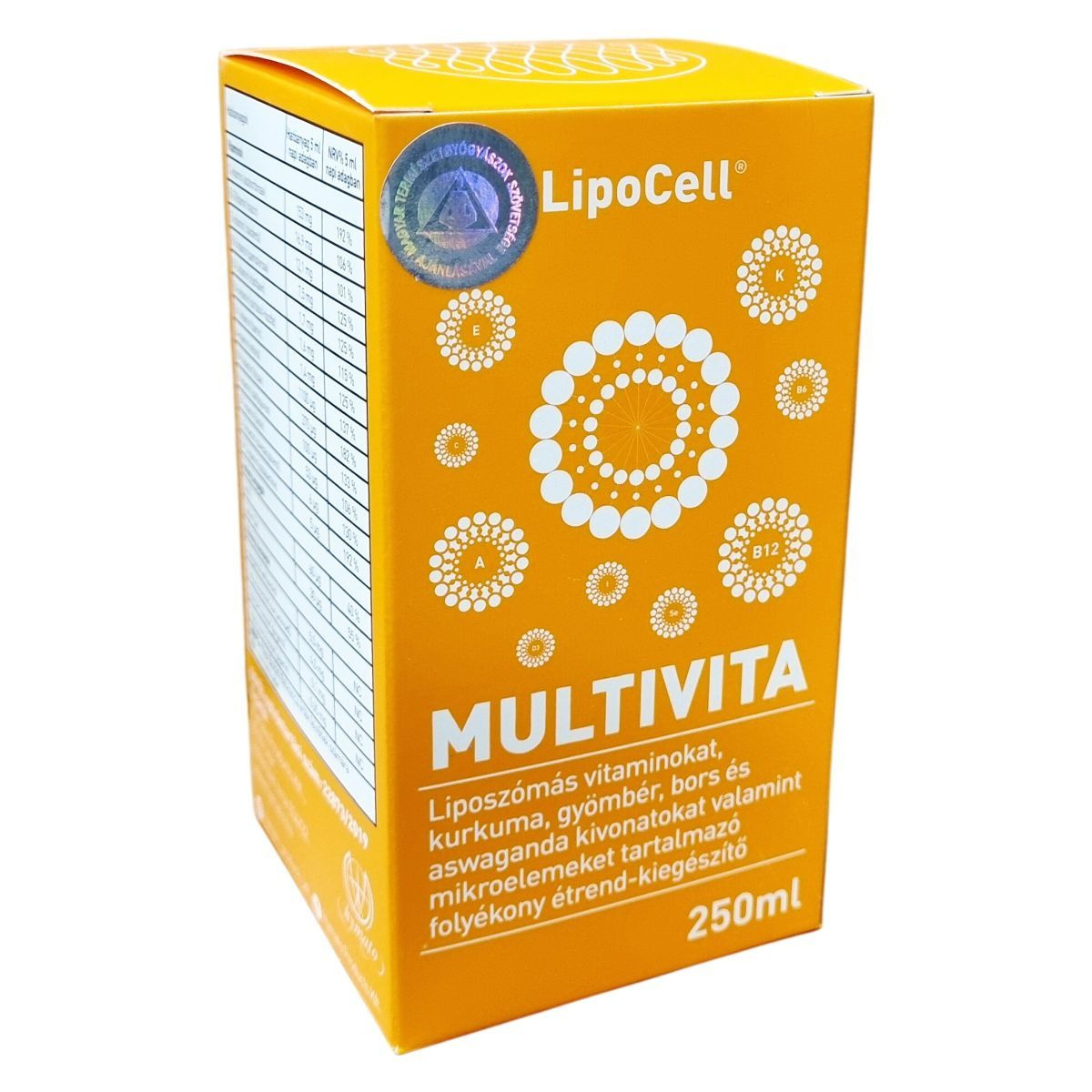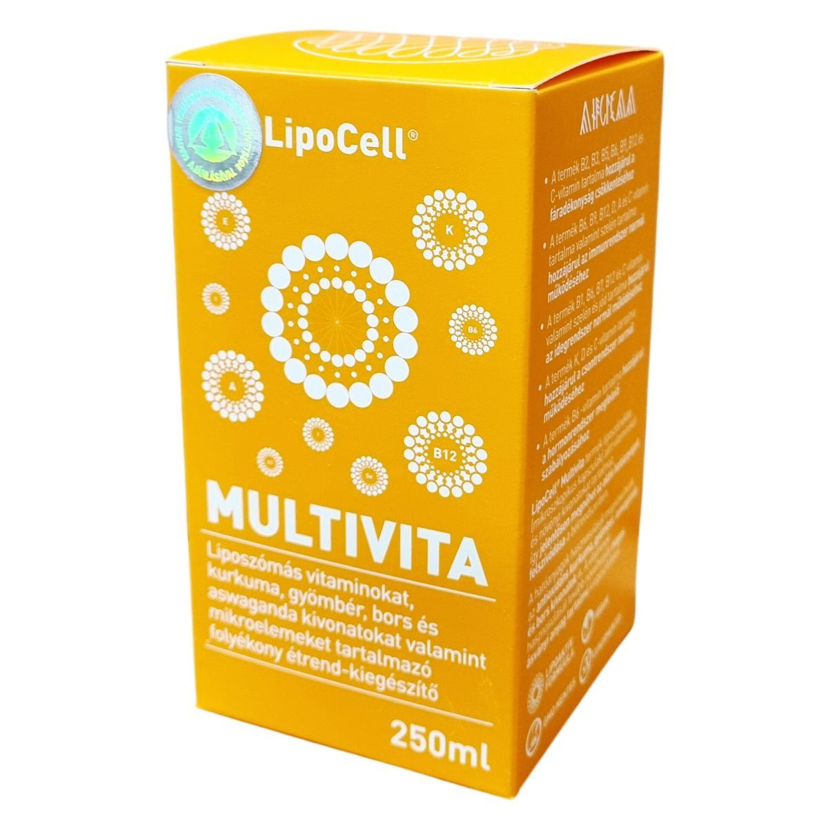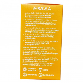 A LipoCell® Multivita egy folyékony étrend-kiegészítő, amely liposzómákba zárt vitaminokat, növényi kivonatokat és mikroelemeket tartalmaz. A liposzómás technológia segítheti az aktív hatóanyagok jelentősen jobb felszívódását a bélrendszerben. Az antioxidánsokat tartalmazó kurkuma, gyömbér, aswaganda és fekete bors kivonatok hozzájárulhatnak a vitaminok hatékonyabb hasznosulásához. A termék vitamin- és ásványi anyag tartalma többféle szervezeti funkció támogatására lehet alkalmas, például hozzájárulhat a fáradékonyság csökkentéséhez, az immunrendszer és az idegrendszer normál működéséhez, a csontrendszer egészségéhez, valamint a hormonrendszer megfelelő szabályozásához. A termék vegán étrendbe illeszthető, GMO-mentes és hozzáadott cukrot nem tartalmaz.