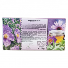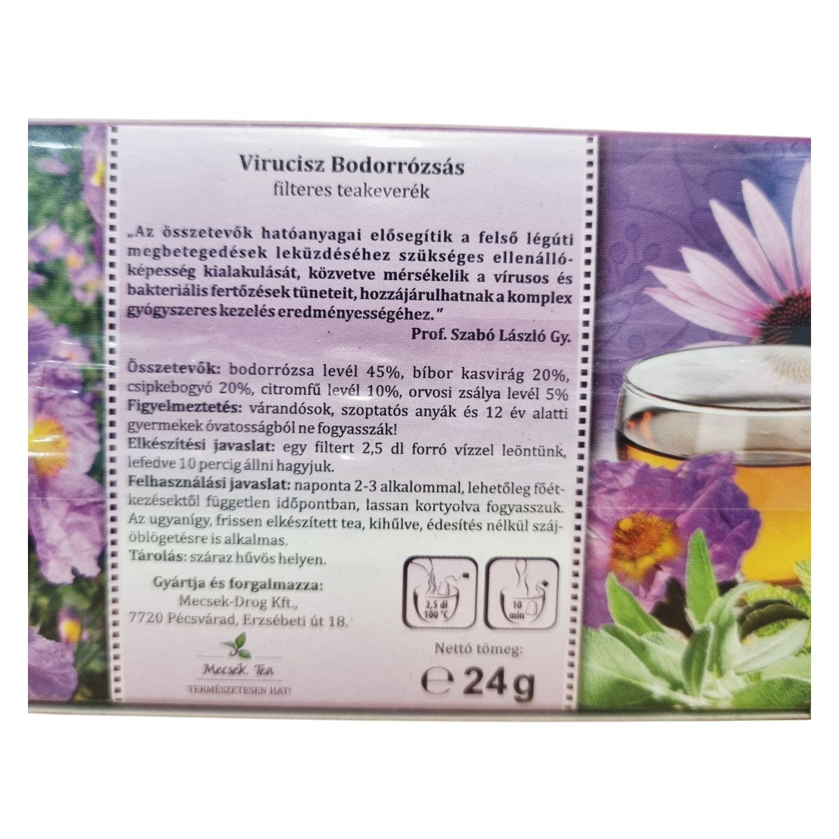 A Virucisz Bodorrózsás filteres teakeverék elkészítése során egy aromazáró tasak tartalmát 2,5 dl forró (100°C) vízzel kell leönteni, majd lefedve 10 percig állni hagyni. A tea frissen elkészítve, de kihűlés után édesítés nélkül szájöblögetésre is alkalmas. A gyógynövények hatóanyagai elősegíthetik a felső légúti megbetegedések leküzdéséhez szükséges ellenállóképesség kialakulását, mérsékelhetik vírusos és bakteriális fertőzések tüneteit, és hozzájárulhatnak a komplex gyógyszeres kezelés eredményességéhez. A termék Nettó tömege 24 g, 20 aromazáró filtert tartalmaz. Mecsek Tea természetesen hat!