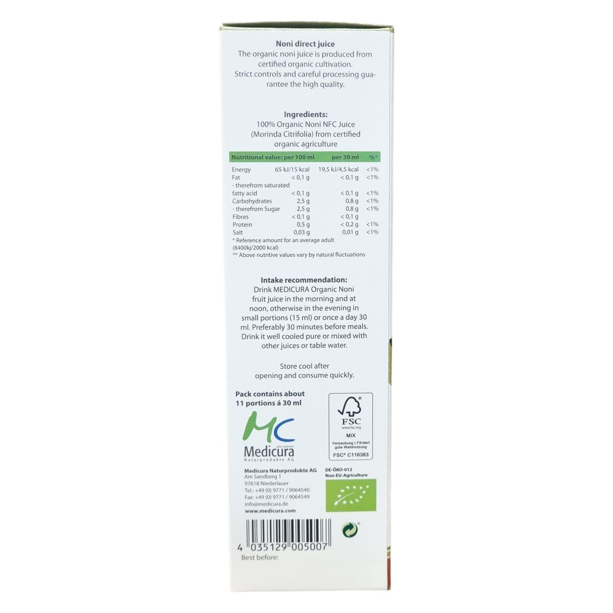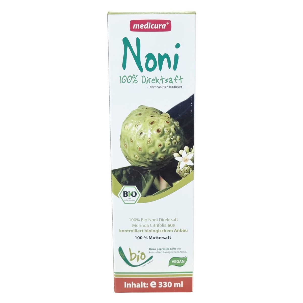 A Medicura Noni bio noni direktlé szigorú minőségellenőrzés és kíméletes feldolgozás eredményeként készül, hogy megőrizze természetes összetevőit. A termék nem tartalmaz hozzáadott anyagokat, kizárólag a Morinda Citrifolia gyümölcs friss levét tartalmazza, amely garantáltan organikus gazdálkodásból származik. A kevesebb, mint 0,1 g zsírtartalom mellett az ital alacsony energiatartalmú, könnyen beilleszthető a mindennapi táplálkozásba. A csomag körülbelül 11 adag 30 ml-es részt tartalmaz, melyeket a felbontás után hűtve kell tárolni. A termék vegán és bio minősítésű, a minőségellenőrzéseket a HU-ÖKO-01/Biokontroll felügyeli. A gyártást a német Medicura Naturprodukte AG végzi, forgalmazása az ODP Vital Kft. feladata. A termék FSC MIX csomagolású, támogatva a felelős erdőgazdálkodást.