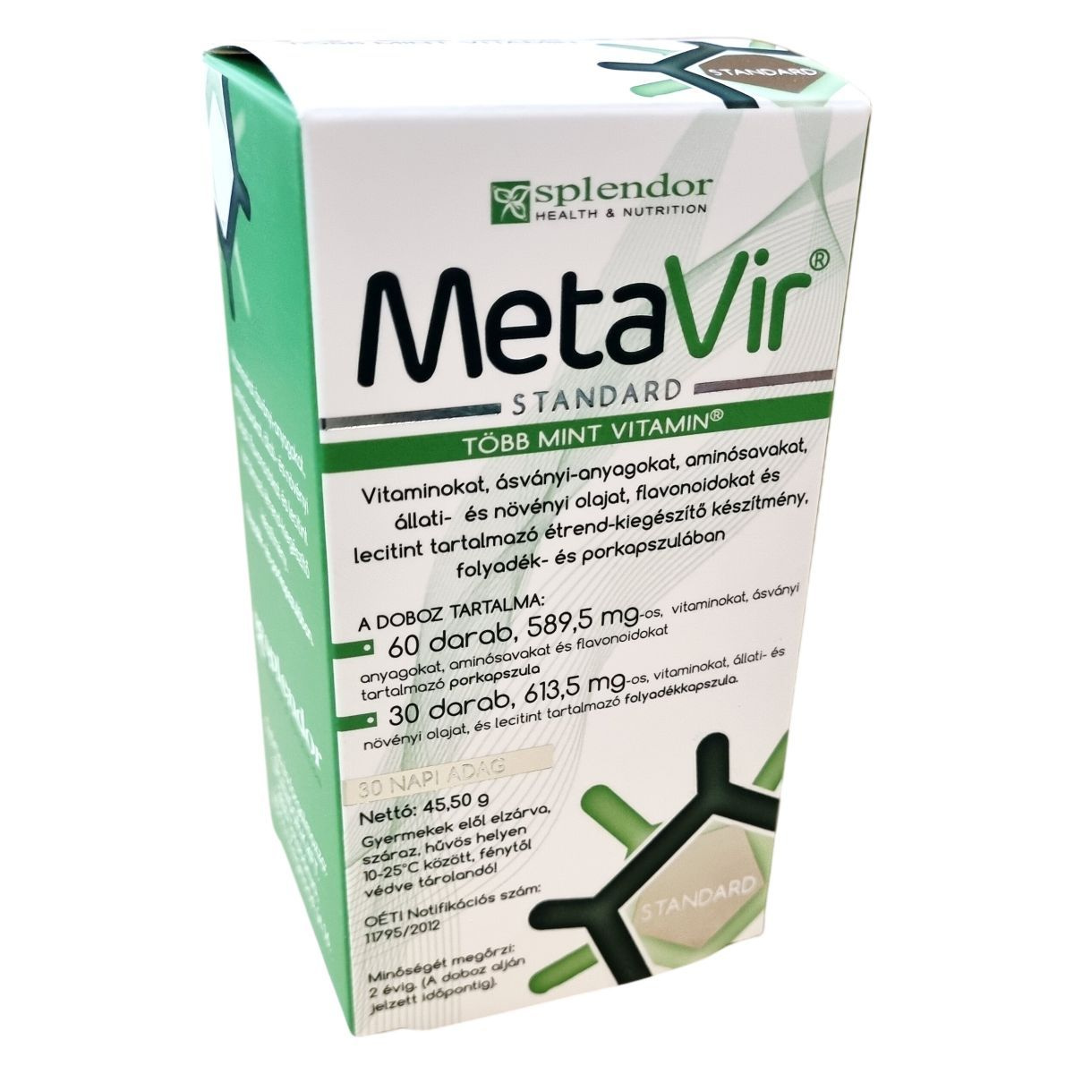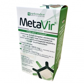 A MetaVir Standard komplex összetételű étrend-kiegészítő, amely vitaminokat, ásványi anyagokat, aminosavakat, flavonoidokat, lecitint, valamint állati és növényi olajokat tartalmaz. A csomag 60 db porkapszulát és 30 db folyadékkapszulát tartalmaz, amely 30 napi adag biztosítására elegendő.