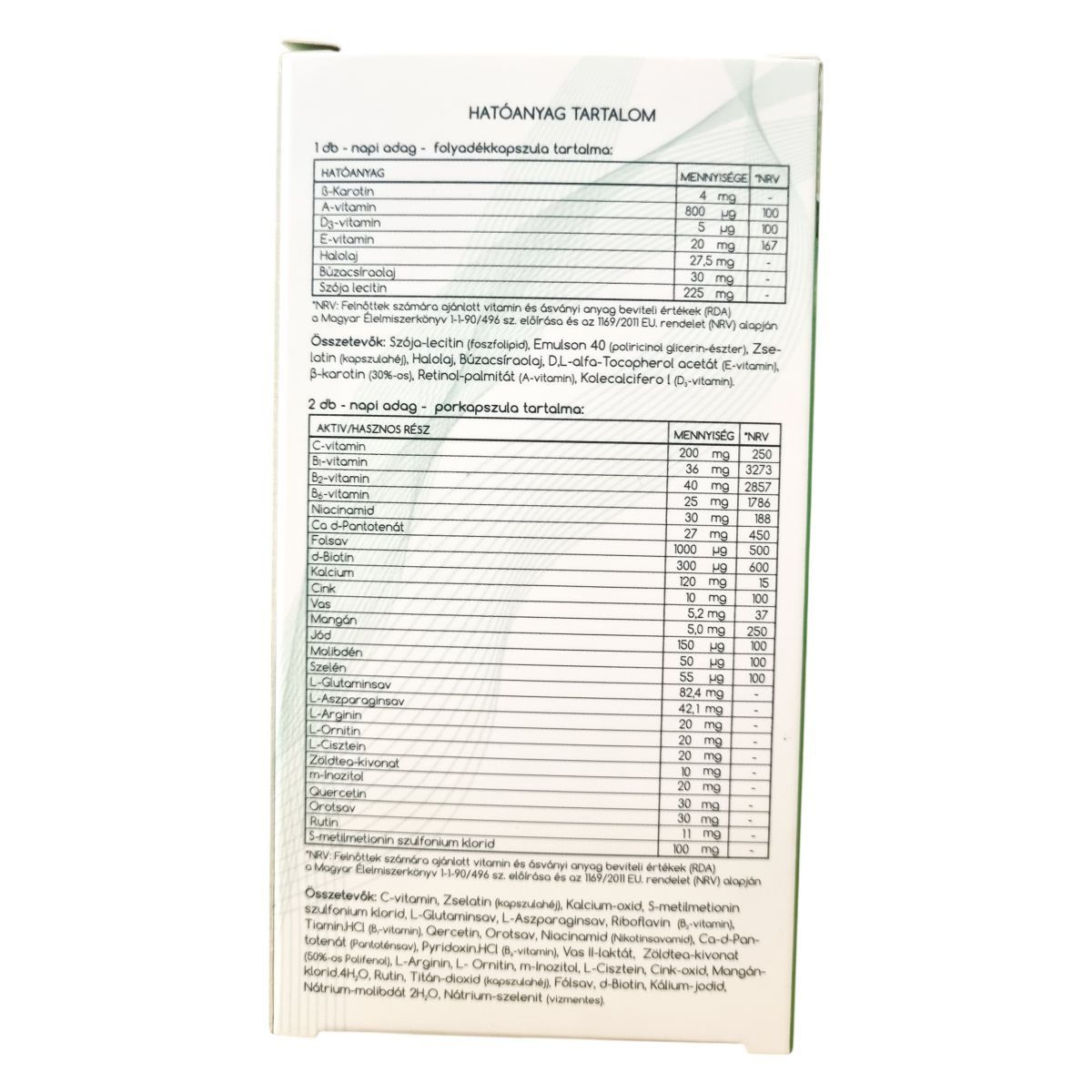 szója-lecitin (foszfolipid), emulson 40 (poliricinol glicerin-észter), zselatin, halolaj, búzacsíraolaj, DL-alfa-tokoferol-acetát, béta-karotin, retinol-palmitát, kolekalciferol, C-vitamin, kalcium-oxid, S-metilmetionin szulfonium-klorid, L-glutaminsav, L-aszparaginsav, riboflavin, tiamin-HCl, quercetin, orotsav, niacinamid, kalcium-D-pantotenát, piridoxin-HCl, vas(II)-laktát, zöldtea-kivonat, L-arginin, L-ornitin, m-inozitol, L-cisztein, cink-oxid, mangán-klorid, rutin, titán-dioxid, folsav, D-biotin, kálium-jodid, nátrium-molibdát, nátrium-szelenit
