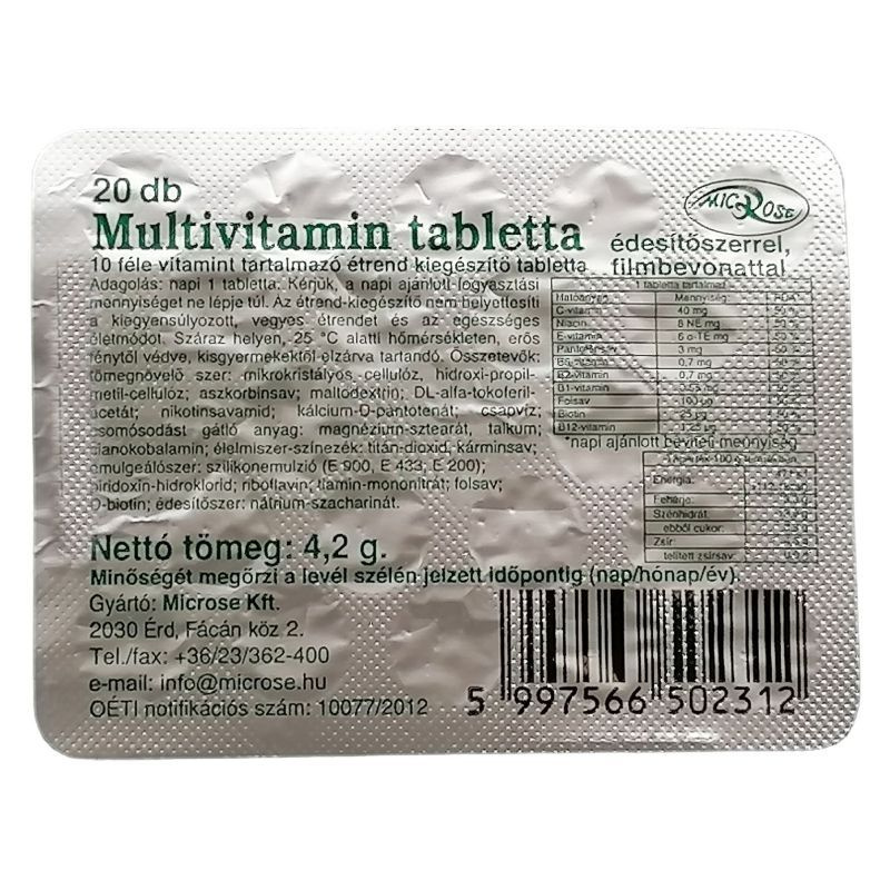 10 féle vitamint tartalmazó étrend kiegészítő tabletta. Adagolás: napi 1 tabletta. Kérjük, a napi ajánlott fogyasztási mennyiséget ne lépje túl. Az étrend-kiegészítő nem helyettesíti a kiegyensúlyozott, vegyes étrendet és az egészséges életmódot. Száraz helyen, 25 C alatti hőmérsékleten, erős fénytől védve, kisgyermekektől elzárva tartandó. Származási hely: Magyarország.