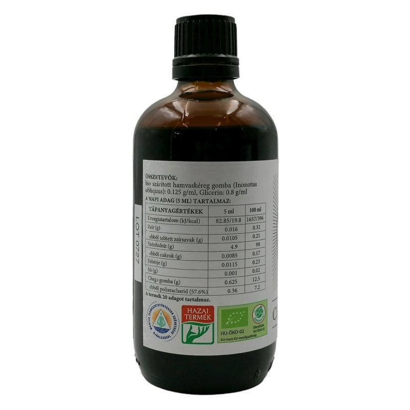 Összetétel: bio szárított hamvaskéreg gomba (Inonotus obliquus): 0,125 g/ml, glicerin: 0,8 g/ml, 57% poliszacharid tartalom. A termék 20 adagot tartalmaz.