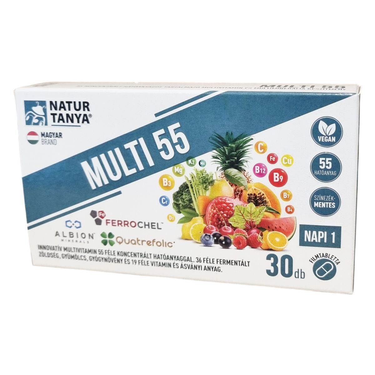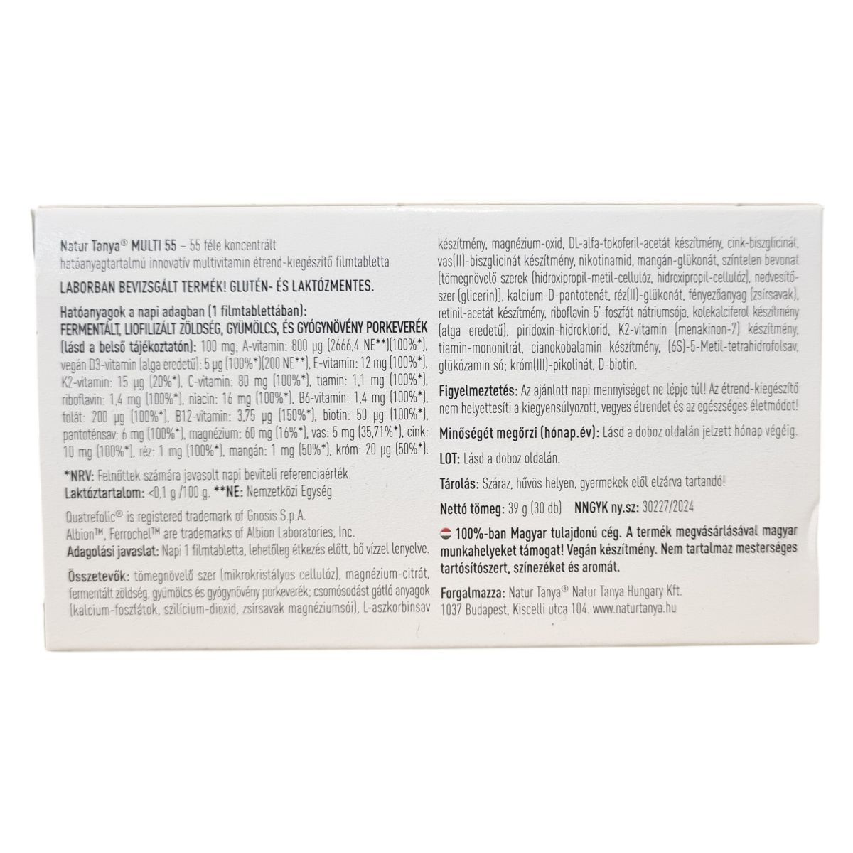 A Natur Tanya® MULTI 55 filmtabletta egy laboratóriumban bevizsgált, glutén- és laktózmentes készítmény, amely 55 féle koncentrált hatóanyagot tartalmaz. Ezek között szerepelnek fermentált és liofilizált zöldség-, gyümölcs- és gyógynövényporok, valamint 19 féle vitamin és ásványi anyag, mint például A-vitamin, vegán forrásból származó D3-vitamin, E- és K2-vitamin, továbbá B-vitamin komplex, magnézium, vas, cink, réz, mangán és króm. A termék nem tartalmaz mesterséges tartósítószert, színezéket és aromát. A filmtabletták színezékmentesek, és egy filmtabletta napi adagja. A termék hozzájárulhat a vegán étrend követéséhez, és előállítása 100%-ban magyar tulajdonú cég munkáját támogatja.