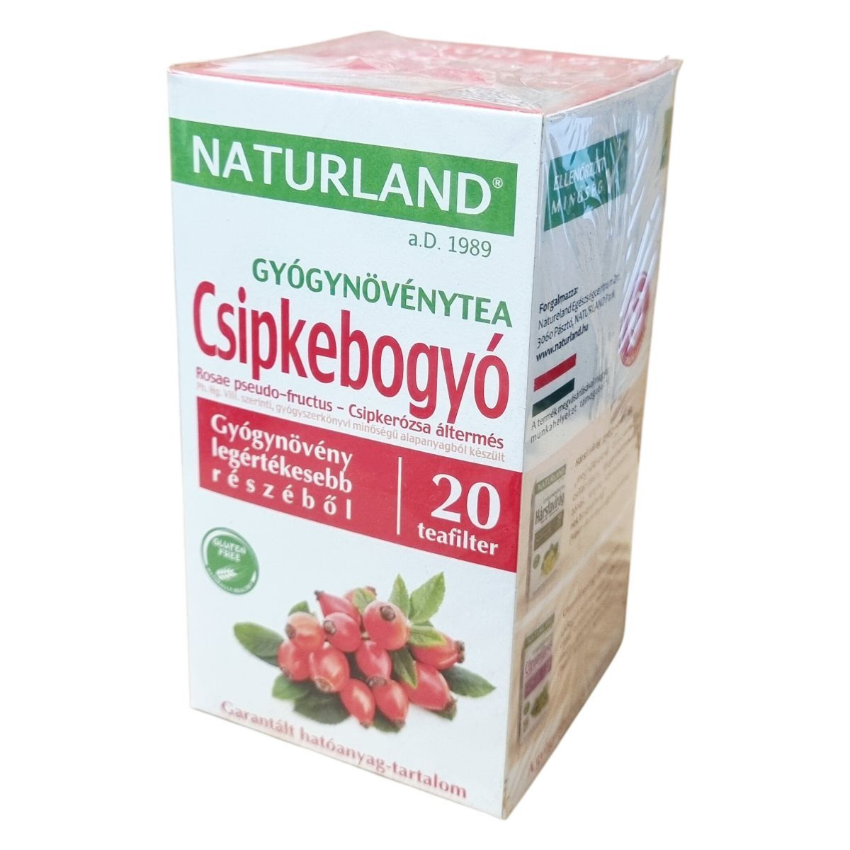 A Naturland csipkebogyó gyógynövénytea Ph. Hg. VIII. szerinti, gyógyszerkönyvi minőségű alapanyagból készül a csipkebogyó gyógynövény legértékesebb részéből. A termék gluténmentes és vegán, garantált hatóanyag-tartalommal rendelkezik. Az ajándékpont-gyűjtő akcióban a termék csomagolásán található pontokkal természetes kiválasztott ajándékokra lehet jogosult a vásárló, mint például C-vitamin tabletta vagy különböző natúrszerek. Az akció részletei és a felhasználási feltételek a csomagoláson és a Naturland weboldalán érhetők el. A termékkel való vásárlás magyar munkahelyeket támogat.