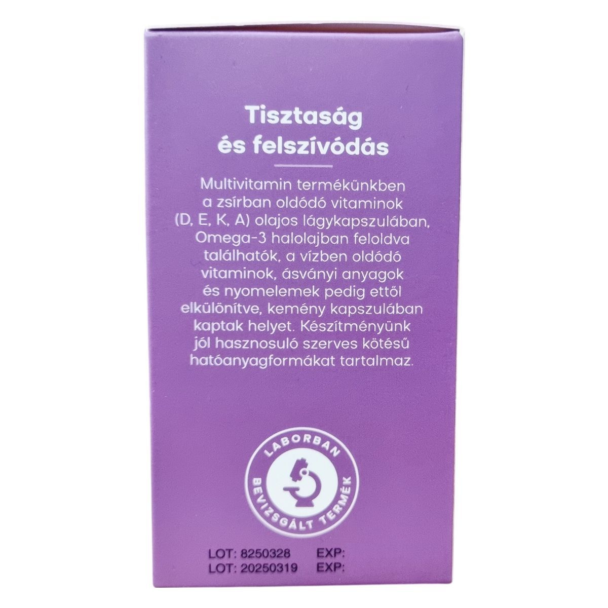 Multivitamin termékünkben a zsírban oldódó vitaminok (D, E, K, A) olajos lágykapszulában, Omega-3 halolajban feloldva találhatók, a vízben oldódó vitaminok, ásványi anyagok és nyomelemek pedig ettől elkülönítve, kemény kapszulában kaptak helyet.