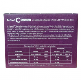 A Novo C® komplex a hagyományos készítményektől eltérően liposzómás bevonattal készült, amely egy természetes foszfolipid réteget képez a C-vitamin, D3-vitamin és cink hatóanyagok körül. Ez a védőburok segítheti a hatóanyagok hatékonyabb sejtbe jutását. A termék hozzájárulhat az immunrendszer normál működéséhez, a sejtek oxidatív stresszel szembeni védelméhez, a fáradtság csökkentéséhez és a normál pszichológiai funkció fenntartásához. A csipkebogyó-kivonat és a citrus bioflavonoidok természetes összetevői a komplexnek, amelyek további támogatást nyújthatnak az egészség megőrzéséhez. A készítmény 8 éves kortól ajánlott, és napi 1-2 kapszula fogyasztása javasolt bő folyadékkal, lehetőleg reggel.