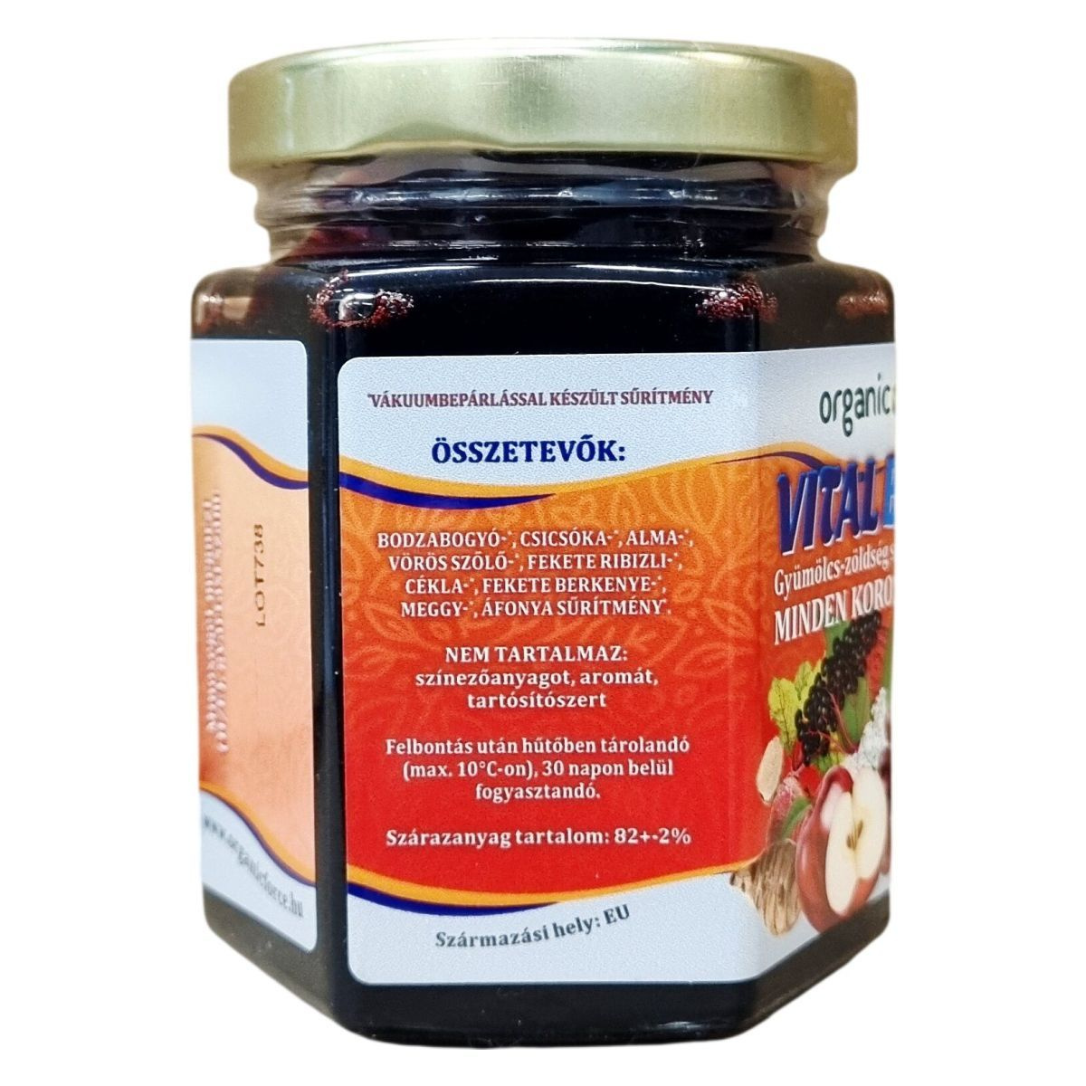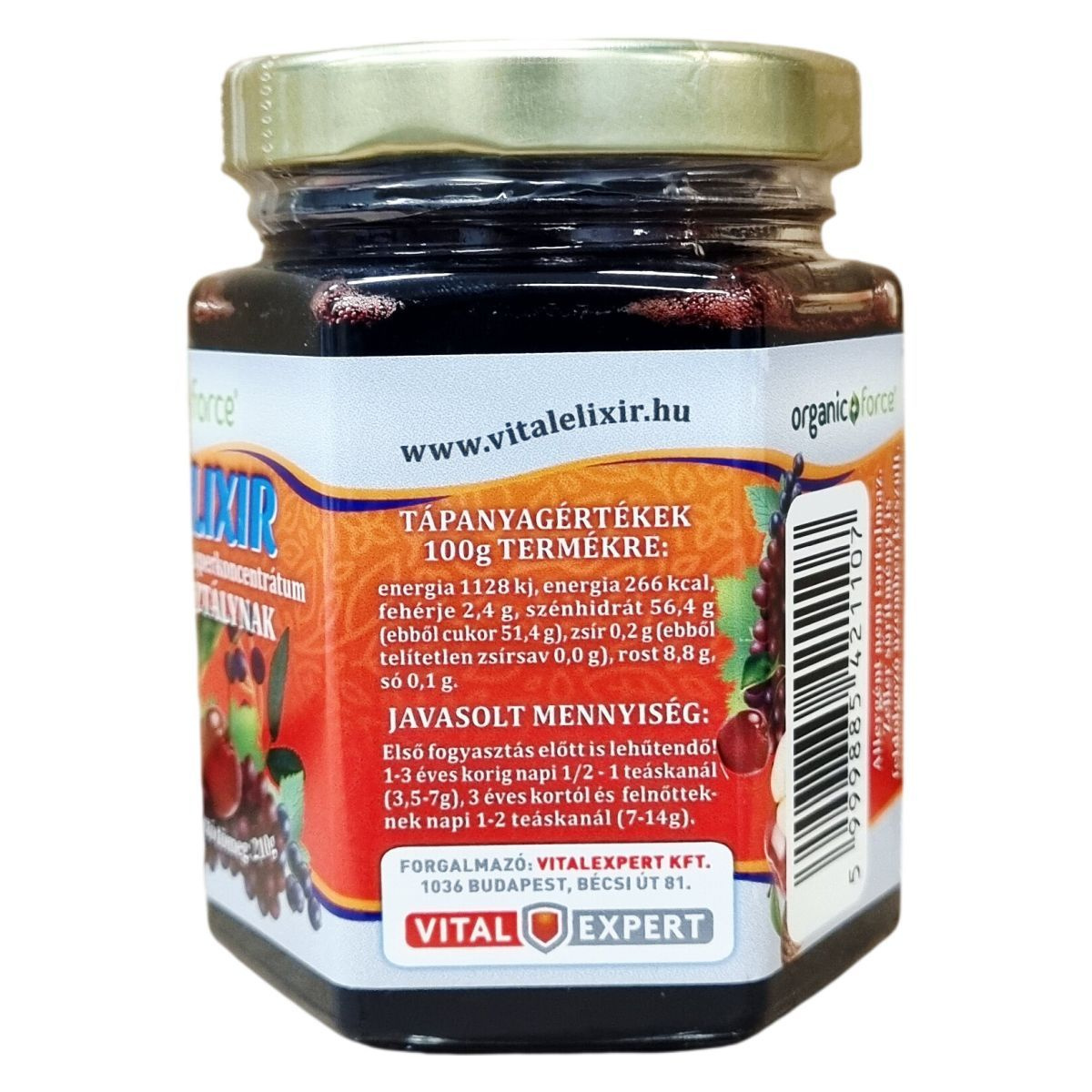 A Vital Elixir vákuumbepárlással készült sűrítmény, amely különböző gyümölcsök és zöldségek koncentrált kivonatát tartalmazza. Nem tartalmaz színezőanyagot, aromát vagy tartósítószert. Szárazanyag tartalma 82±2%. A termék származási helye az Európai Unió.
