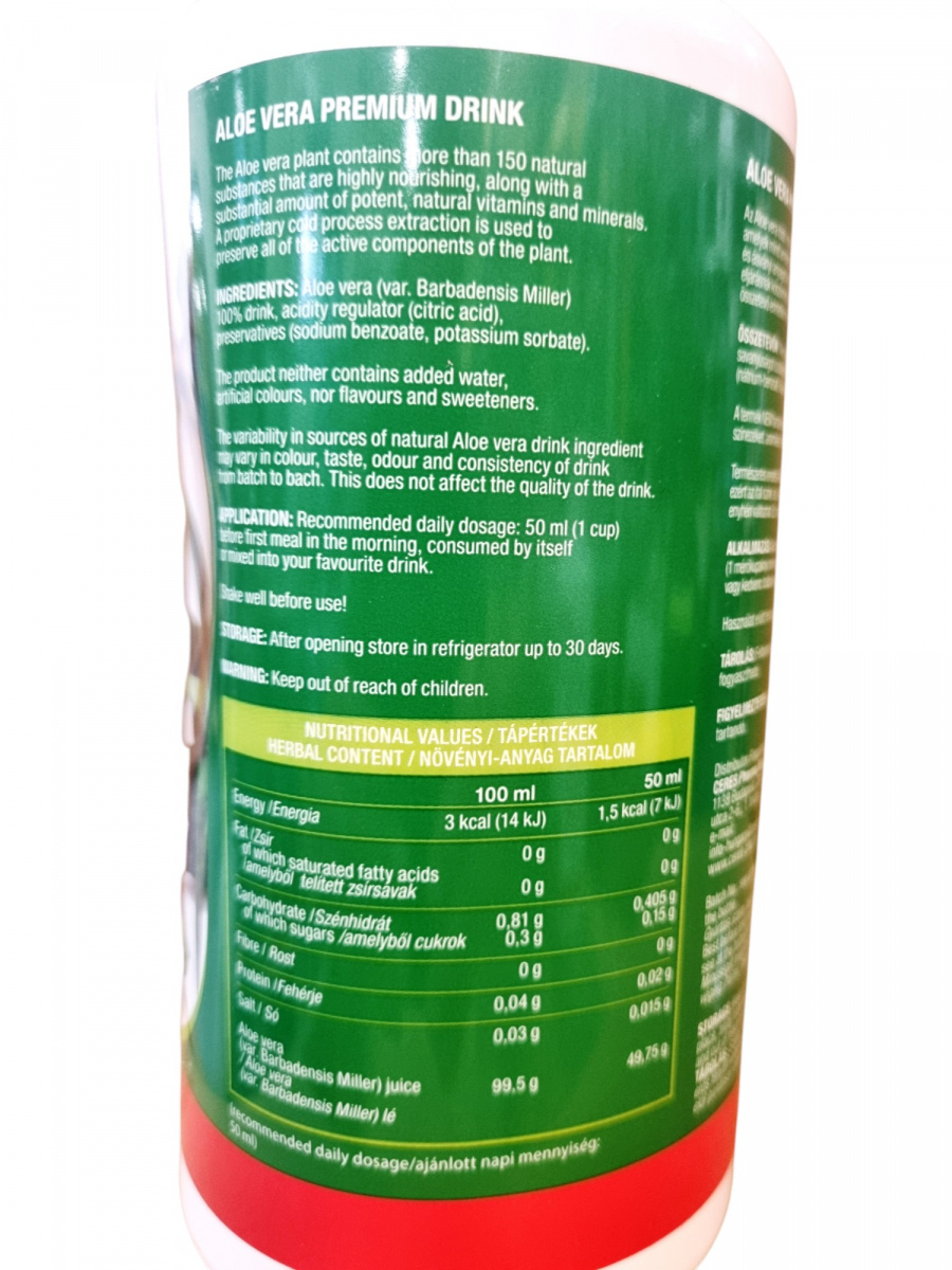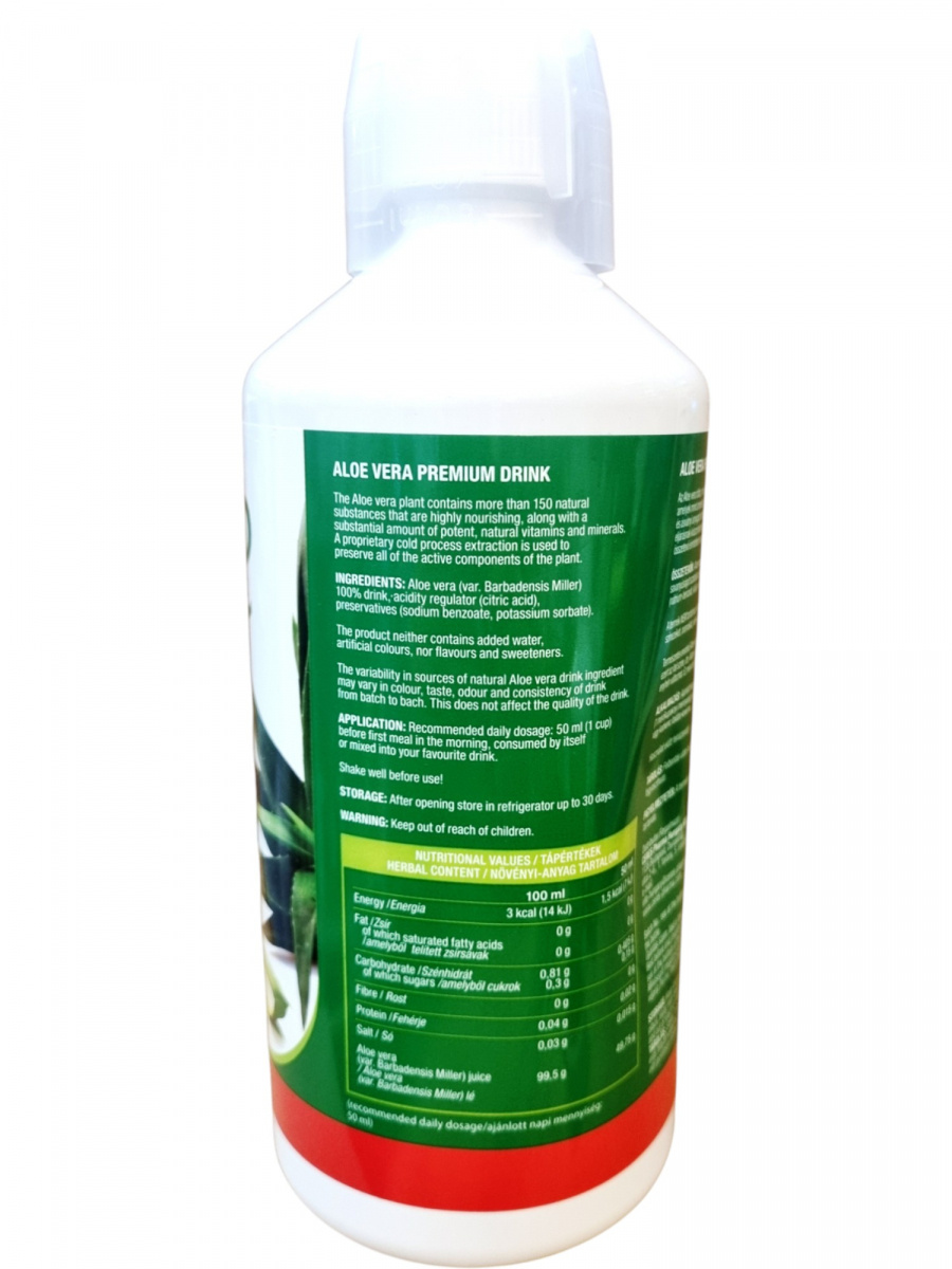 Az Aloe Vera Premium ital több mint 150 természetes hatóanyagot tartalmaz, köztük vitaminokat, ásványi anyagokat és nyomelemeket. A hideg extrakciós eljárás biztosítja, hogy az aktív összetevők épek maradjanak, így a termék hozzájárulhat a szervezet mindennapi vitalitásához és a bélrendszer megfelelő működéséhez. Magas aloe vera gél-tartalma miatt frissítő és természetes étrend-kiegészítő, amely támogatja a hidratáltságot, és kíméletesen segítheti az emésztést.