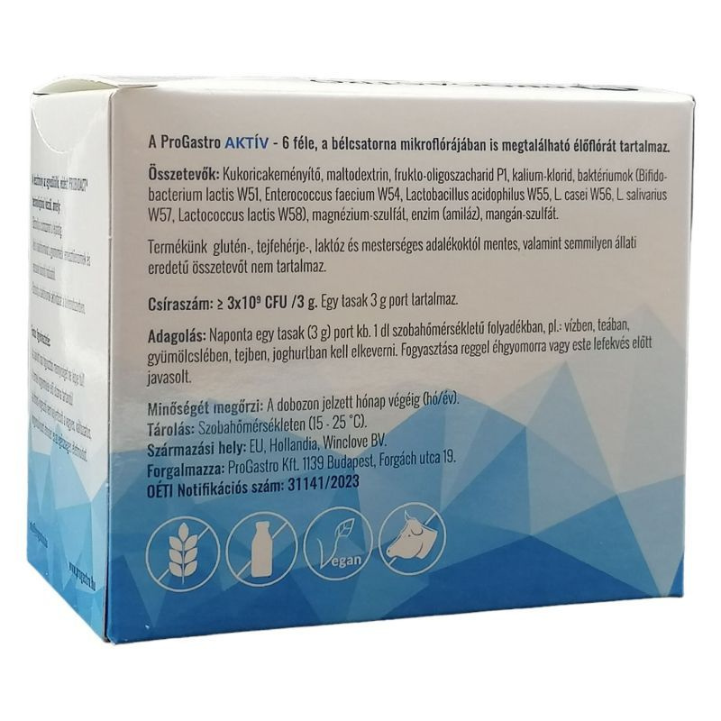 Termékünk a világon egyedülálló ProbioAct technológiával készült, mely biztosítja a baktériumok élettartamát, stabilitását és minőségét. A ProGastro AKTÍV glutén-, tejfehérje-, laktóz és mesterséges adalékoktól mentes, valamint semmilyen állati eredetű összetevőt nem tartalmaz.