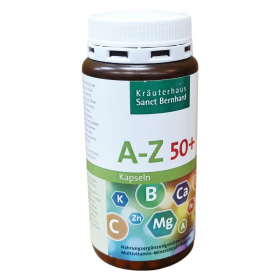 Az A-Z 50+ kapszula egy kiegyensúlyozott, az idősebb korosztály vitamin- és ásványianyag-szükségletét figyelembe vevő étrend-kiegészítő. Vitaminokat és ásványi anyagokat tartalmaz, amelyek hozzájárulhatnak a szervezet megfelelő működéséhez és általános egészségének megőrzéséhez. A termék kizárólag felnőttek számára ajánlott, napi egy kapszula adagolásával, főétkezés előtt, bő folyadékkal. Az összetevők között megtalálható többek között kalcium, magnézium, C- és D-vitamin, valamint nyomelemek, mint a cink, króm és vas. A termék világos, száraz helyen történő tárolását javasolják, és gyermekektől elzárva kell tartani. A kapszulák Németországban készülnek, és kizárólag kiegészítő funkcióval bírnak, nem helyettesítve a változatos étrendet és az egészséges életmódot.