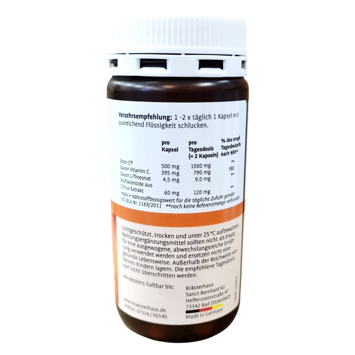 Az Ester-C® kapszula egy étrend-kiegészítő készítmény, melyben a C-vitamin egy speciális, kalcium-aszkorbát formában van jelen, kiegészítve L-treonáttal és citrus bioflavonoid kivonattal. A termék porciózott adagolásban, kapszula formában készül és 120 kapszulát tartalmaz, összesen 85 gramm súlyban. A termék színtiszta, minőségét megőrzi a dobozon jelzett időpontig. A kapszulát legfeljebb 25 °C-on, száraz, fénytől védett helyen kell tárolni. Gyártási helye Németország, forgalmazója az ODP Vital Kft. A termék nem helyettesíti a változatos és kiegyensúlyozott étrendet, valamint az egészséges életmódot, ezért annak részeként használata ajánlott. A készítményt gyermekektől elzárva kell tartani, és a javasolt adagolás pontos betartása fontos.