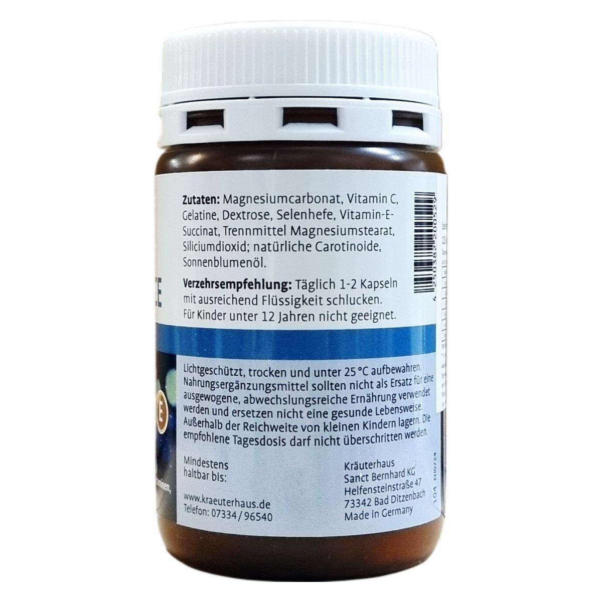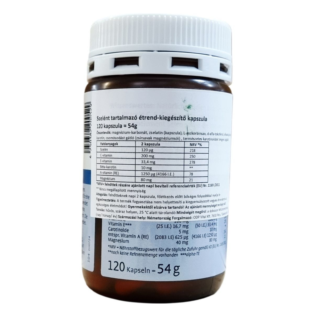 Szelént, valamint A-, C- és E-vitamint tartalmazó étrend-kiegészítő kapszula, amely vitaminokat, ásványi anyagokat és természetes karotinoidokat tartalmaz. Németországban készült termék, 120 kapszulás kiszerelésben, össztömege 54 g.