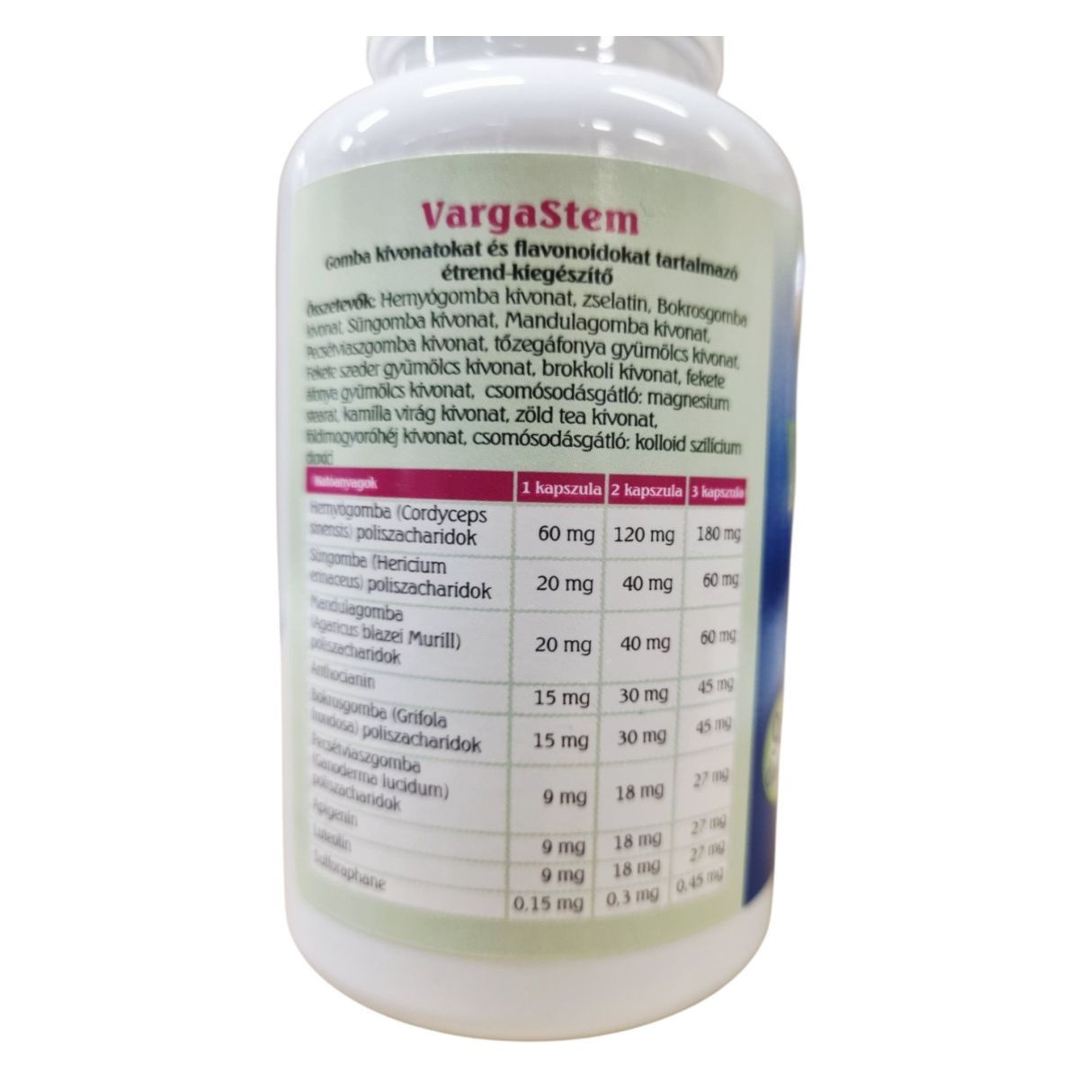 A VargaStem étrend-kiegészítő különféle gomba kivonatokat és flavonoidokat tartalmaz, amelyek hozzájárulhatnak az immunrendszer támogatásához. A termék hernyógomba, bokrosgomba, süngomba, mandulagomba és reishi gomba kivonatokat tartalmaz, amelyek poliszacharidokban gazdagok lehetnek. Emellett tőzegáfonya, fekete szeder, brokkoli és fekete áfonya gyümölcs kivonatok is megtalálhatók benne. A termék használata során fontos betartani az ajánlott napi mennyiséget, és figyelembe venni, hogy nem helyettesíti a kiegyensúlyozott étrendet és az egészséges életmódot.