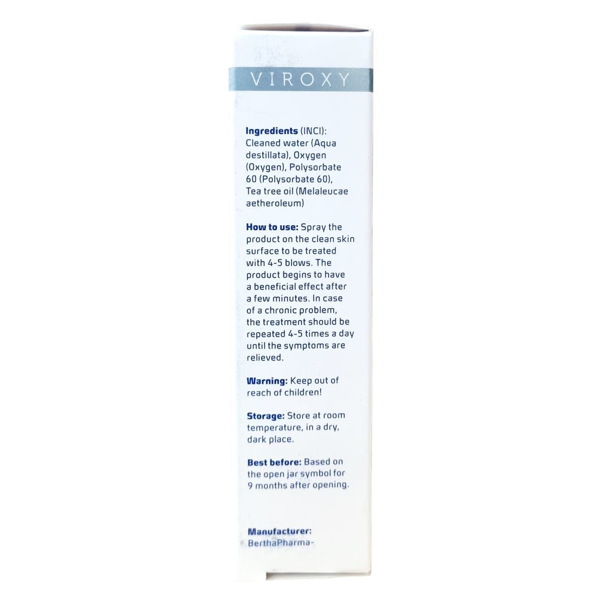 A VIROXY O1 spray egy aktív oxigén alapú kozmetikum, amely átfogó vírus-, baktérium- és gombaellenes hatással rendelkezik, elősegítve a bőr gyors regenerálódását és a nyálkahártyák megnyugtatását.