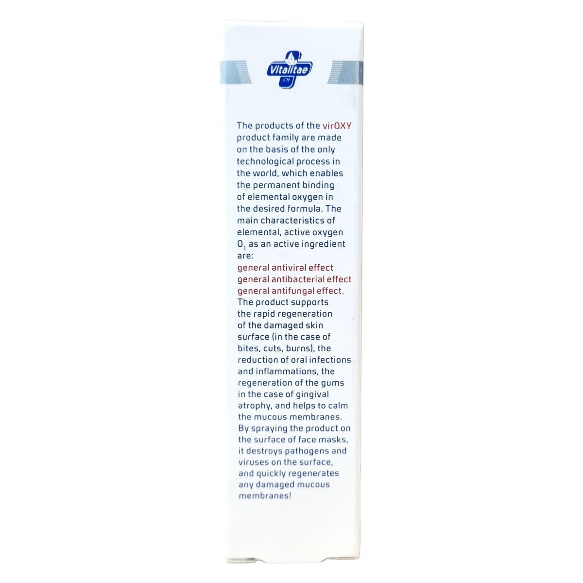 A VIROXY termékcsalád egyedülálló technológiával készült, amely lehetővé teszi az aktív oxigén tartós kötését a formulában. Az O1 aktív oxigén hatóanyaga általános vírus-, baktérium- és gombaellenes hatást biztosít. Támogatja a sérült bőrfelület, például rovarcsípések, vágások vagy égési sérülések gyors regenerálódását, csökkenti a szájfertőzéseket és gyulladásokat, valamint elősegíti az íny regenerációját ínyatrófia esetén. Segíti a nyálkahártyák megnyugtatását is. Arcmaszkok felületén permetezve elpusztítja a kórokozókat és vírusokat, valamint gyors regenerálódást biztosít a sérült nyálkahártyáknak.