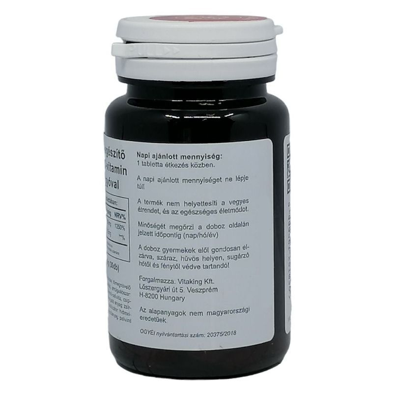 A C-vitamin hozzájárul a normál kollagén képződéshez és ezen keresztül az alábbi funkciókhoz: az erek normál állapotának, működésének fenntartásához. a normál csontozat fenntartásához. a porcok normál állapotának, működésének fenntartásához. a fogíny normál állapotának fenntartásához. a bőr normál állapotának, működésének fenntartásához. a fogak normál állapotának fenntartásához. OÉTI bejegyzési szám: 6449/2010. Napi ajánlott mennyiség: 1 tabletta. A felhasználási javaslatban megadott mennyiséget ne lépje túl! A termék nem helyettesíti a vegyes étrendet és az egészséges életmódot. A doboz gyermekek elől gondosan elzárva tartandó!