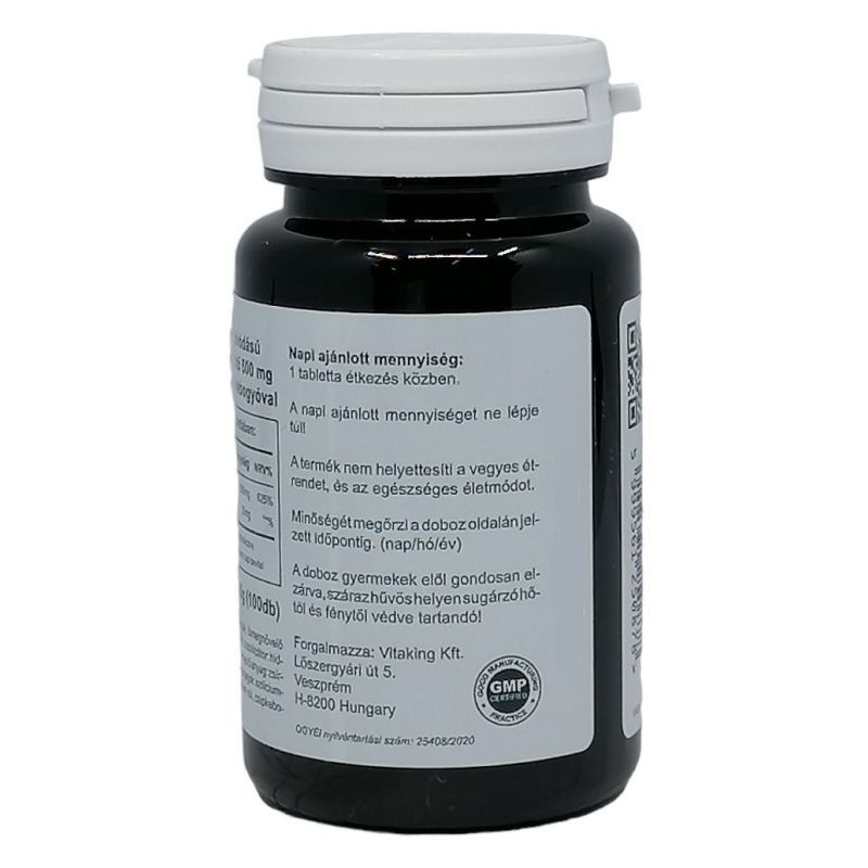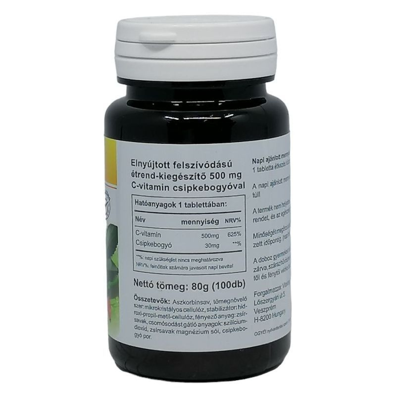 A C-vitamin, egy vízben oldódó vitamin, a szabad-gyökök káros hatásával szemben védi szervezetünket. A zsírban oldódó E-vitaminnal együtt alkalmazva rendkívül hatásos tud lenni. Ma már senki sem vitatja, hogy a szívinfarktus és a koszorúér-betegségek kockázatát jelentősen csökkenti. Szintén jelentősen csökkenti a gyomor- gége- és nyelőcső rák kialakulásának a veszélyét. Jelentős szerepet játszik a növekedésben, a fogak és csontok fejlődésében. Dohányosok számára kiemelten fontos ennek a vitaminnak a rendszeres használata, mert a dohányzás megnehezíti a bevitt C-vitamin felszívódását a szervezetben. A C-vitamin felszívódásában segítenek az ún. bioflavonoidok, ezért a leghatásosabbak a természetes alapanyagokból készült C-vitamin termékek. A C-vitamin és a vas is segítik egymás felszívódását és hasznosulását a szervezetben. A vitamin fontos szerepet játszik immunrendszerünk működésében. Bár, fő hatását az immunrendszeri muködés fokozásán keresztül fejti ki. Növeli a fehérvérsejtek számát, fokozza muködésüket. Vírus- és baktérium-ellenes hatása is bizonyított. A C-vitamin-készítmények enyhíthetik a nátha tüneteit és elősegítik a gyógyulást. Napi ajánlott mennyiség: 1 tabletta. A felhasználási javaslatban megadott mennyiséget ne lépje túl! Hatóanyagok 1 db tablettában: C-vitamin: 500 mg, Csipkebogyó: 14 mg.