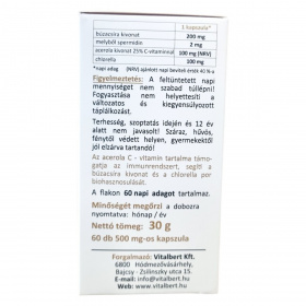 40% búzacsíra kivonat, 20% acerola kivonat, 20% chlorella por, 20% növényi kapszulahéj (hidroxipropil-metil-cellulóz)