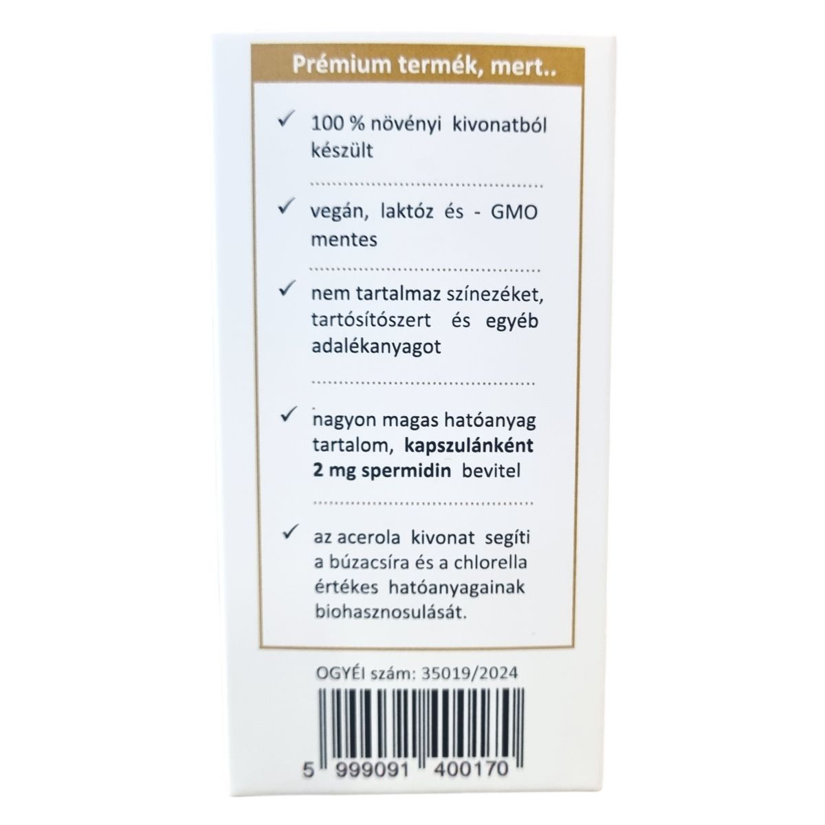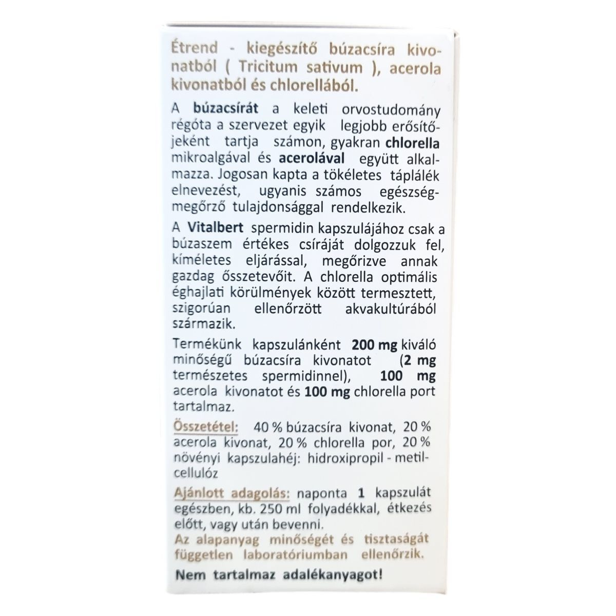 A Vitalbert spermidin kapszulája prémium minőségű növényi alapanyagokból készül, amelyek közül a búzacsíra kivonat természetes spermidint tartalmaz. A termékben található acerola kivonat segítheti a C-vitamin bevitelét és hozzájárulhat a szervezet immunrendszerének támogatásához, valamint elősegítheti a búzacsíra és a chlorella biohasznosulását. A chlorella por egy szigorúan ellenőrzött akvakultúrából származik, optimális éghajlati körülmények között termesztve. A kapszulák nem tartalmaznak színezéket, tartósítószert vagy egyéb adalékanyagot. Az étrend-kiegészítő a búzacsíra értékes csíráját tartalmazza, melyet kíméletes eljárással dolgoznak fel. A termék teljesen vegán és laktózmentes, GMO-mentes, és kapszulánként 2 mg spermidin bevitelét biztosítja a szervezet számára. A készítmény minőségét független laboratóriumban ellenőrzik, és minden adalékanyagtól mentes.