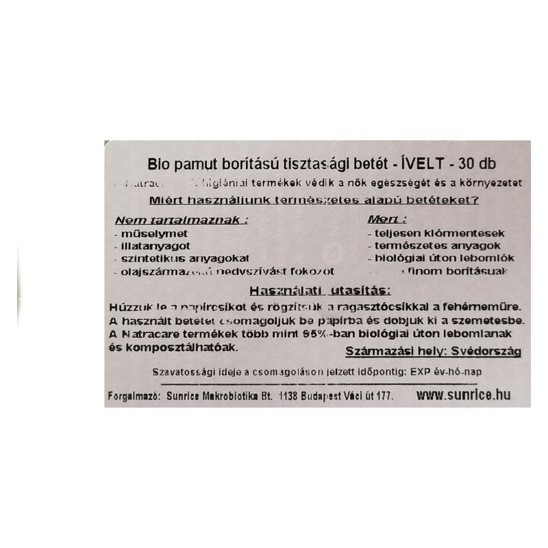 Természetes anyagokból előállított, teljesen klór- és adalékanyag mentes tisztasági betét.