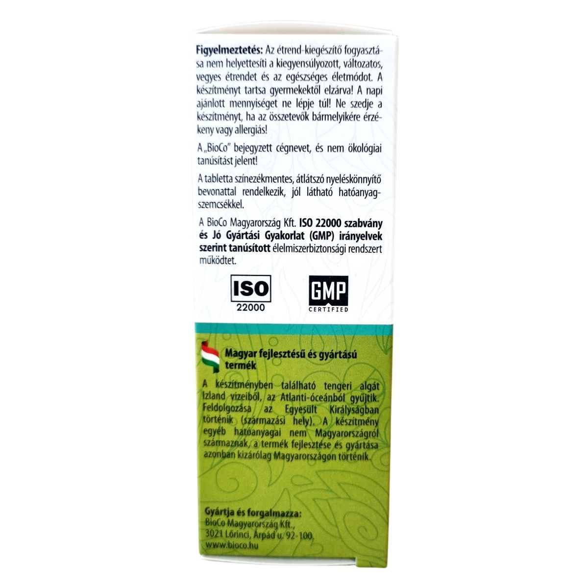 A készítményben található tengeri algát Izland vizeiből, az Atlanti-óceánból gyűjtik, feldolgozása az Egyesült Királyságban történik. A termék a vegán étrendet követők igényei alapján összeállított ásványianyag- és nyomelem-komplexet tartalmaz. A BioCo 100% vegán termékcsalád a vegán életmódot követők számára nyújt megbízható minőséget. Új, színezékmentes, nyeléskönnyítő bevonattal rendelkezik, jól látható hatóanyagszemcsékkel.