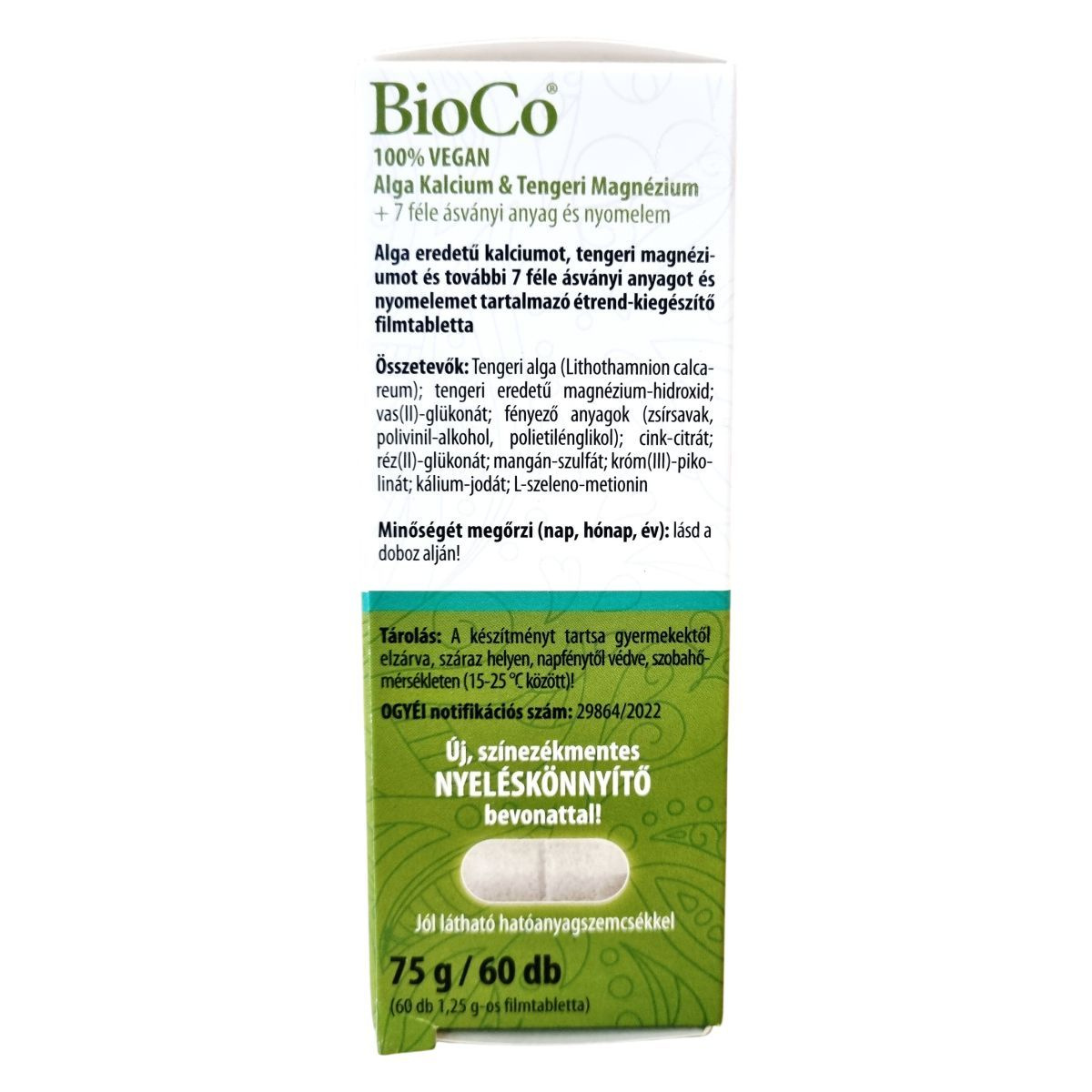 Alga eredetű kalciumot, tengeri magnéziumot és további 7 féle ásványi anyagot és nyomelemet tartalmazó, 100% vegán étrend-kiegészítő filmtabletta.