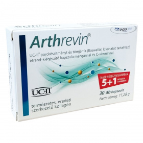 Az Arthrevin® kapszula II. típusú kollagént tartalmazó UC-II® porckészítményt, indiai tömjénfa (Boswellia serrata) gyanta kivonatot, mangánt és C-vitamint foglal magában. Az UC-II® egy szabadalmazott, nem denaturált, az eredeti szerkezetét megtartott, természetes eredetű II. típusú kollagén porított formában, amely étrend-kiegészítési célokra készült. A tömjénfa kivonat hozzájárulhat az ízületek normál állapotának fenntartásához. A C-vitamin szerepet játszhat a normál kollagénképződésben és ezáltal a porcok normál állapotának és működésének fenntartásában. A mangán hozzájárulhat a normál kötőszövet-képződéshez. A termék a SAGER HŰSÉGPROGRAM része és 30 darab kapszulát tartalmaz egy dobozban. A UC-II® és emblémája a Lonza és társvállalatainak védjegyei.