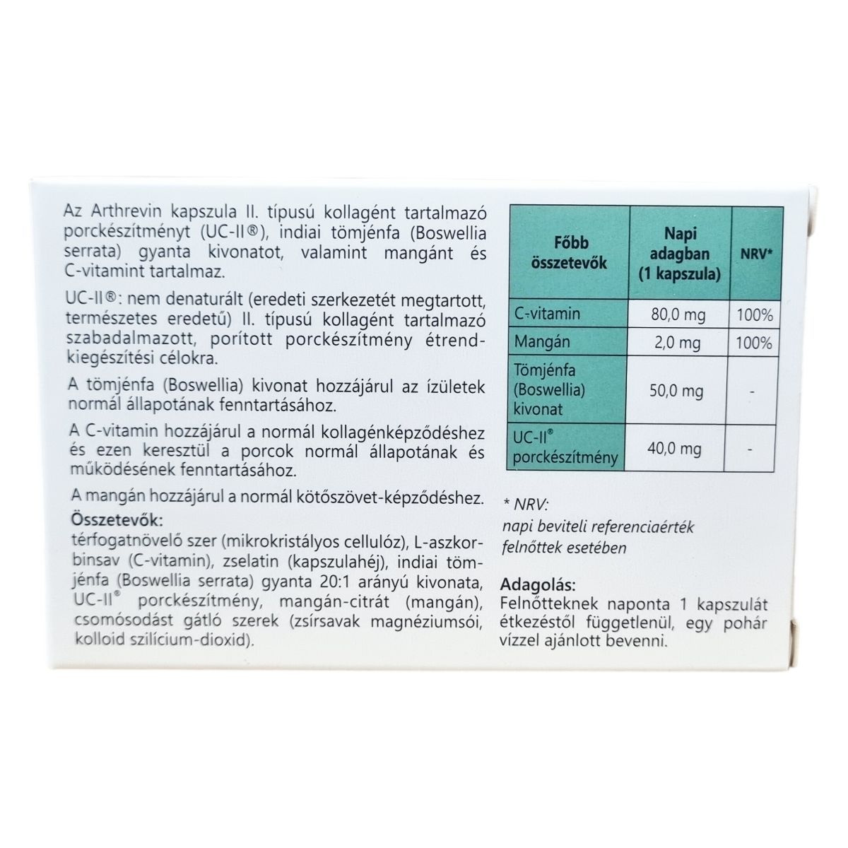 Arthrevin UC-II porckészítményt és tömjénfa (Boswellia) kivonatot tartalmazó étrend-kiegészítő kapszula mangánnal és C-vitaminnal.