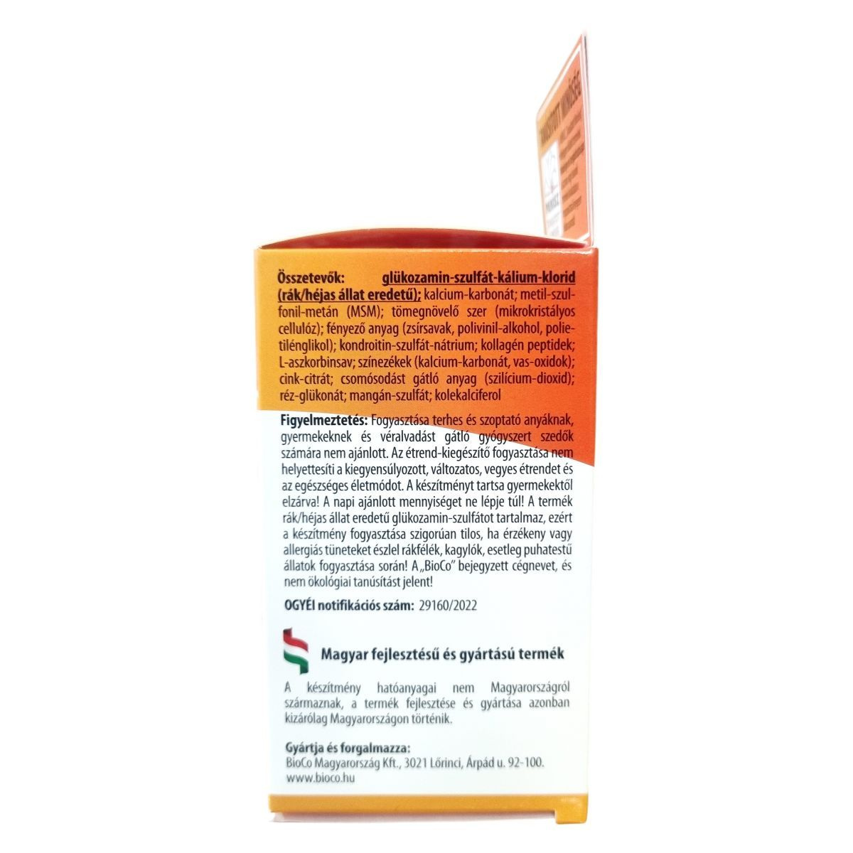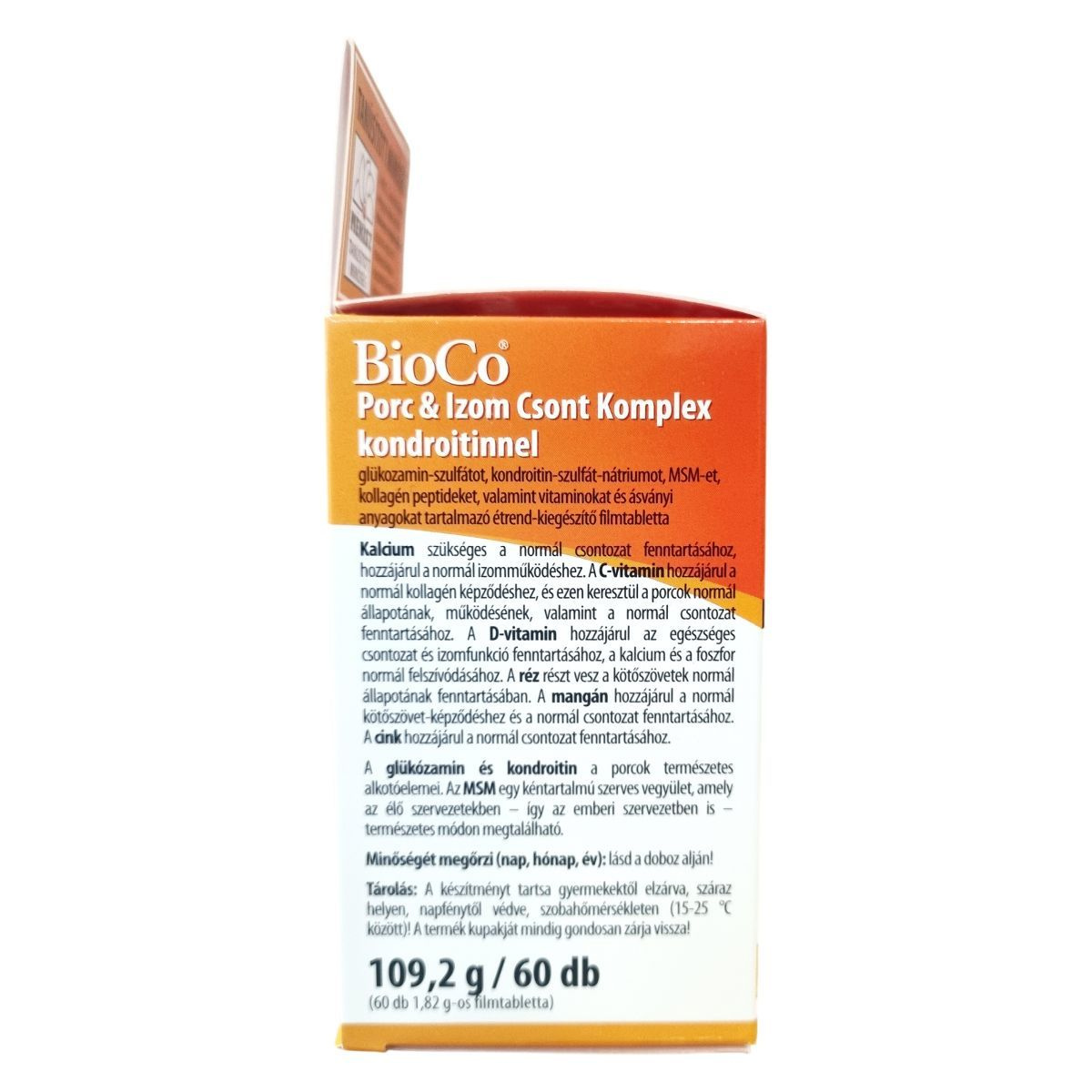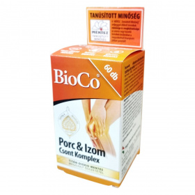 A BioCo Porc & Izom Csont Komplex egy Magyarországon fejlesztett és gyártott étrend-kiegészítő, amely glükozamin-szulfátot, kondroitin-szulfátot, MSM-et, kollagén peptideket, vitaminokat és ásványi anyagokat tartalmaz. A termék titán-dioxid mentes, új nyeléskönnyítő bevonattal rendelkezik, amely elősegítheti a könnyebb alkalmazást. Ajánlott túlsúllyal küzdőknek, sportolóknak, fizikai munkát végzőknek és idősebbeknek, akik fokozottan figyelnek csontrendszerük és izomműködésük egészségére. A készítmény összetevői között megtalálható a kalcium, mely a normál csontozat fenntartásához, a C-vitamin a normál kollagénképződéshez és porcképződéshez járulhat hozzá. A D-vitamin segítheti a kalcium és foszfor normál felszívódását, valamint az izomfunkció fenntartását. A réz és a mangán részt vehet a kötőszövet normál állapotának fenntartásában. A cink hozzájárulhat a csontozat egészségéhez. Az étrend-kiegészítő filmtabletta 60 db-os kiszerelésben kapható, és a készítmény minden adagja megfelel a napi beviteli referenciaértékeknek bizonyos vitaminok és ásványi anyagok esetében. A termék nem tartalmaz laktózt, glutént és titán-dioxidot. Fontos, hogy a termék nem helyettesíti a kiegyensúlyozott étrendet és az egészséges életmódot.