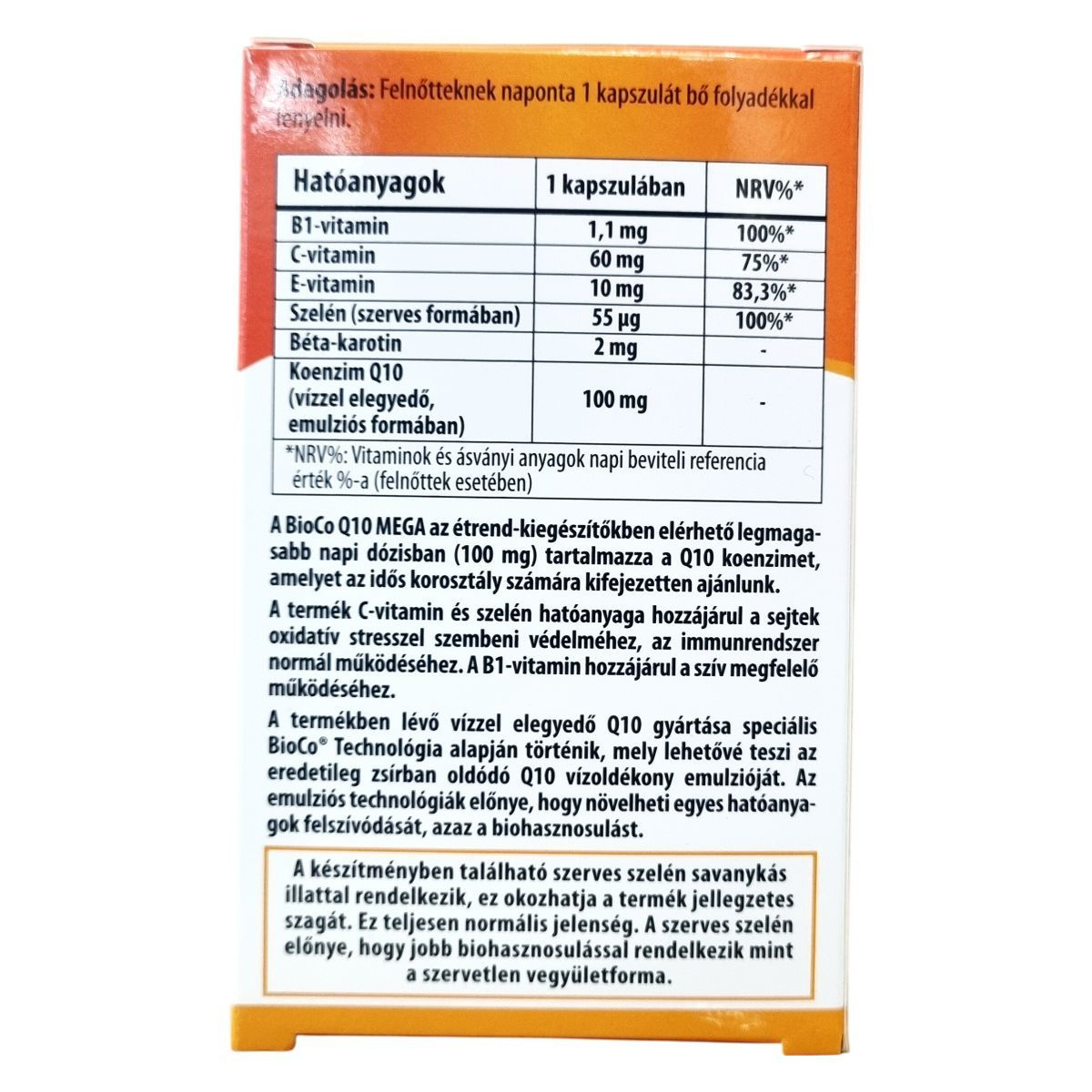 A BioCo Q10 MEGA az étrend-kiegészítők között elérhető legmagasabb, napi 100 mg-os dózisban tartalmazza a koenzim Q10-et, amelyet kifejezetten az idősebb korosztály számára ajánlják. A termék C-vitamin és szelén hatóanyagai hozzájárulhatnak a sejtek oxidatív stresszel szembeni védelméhez és az immunrendszer normál működéséhez, míg a B1-vitamin a szív megfelelő működését támogathatja. A kapszulában lévő vízzel elegyedő Q10 speciális BioCo® Technológia alkalmazásával készül, amely lehetővé teszi a zsírban oldódó Q10 vízoldékony emulziós formájának előállítását, ezáltal a biohasznosulás növelése érdekében. A szerves szelén jelenléte savanykás illatot adhat a készítménynek, ami normális jelenség, továbbá ez a forma jobb biohasznosulású, mint a szervetlen vegyületformáké. A termék magyar fejlesztésű és gyártású, bár hatóanyagai nem Magyarországról származnak.