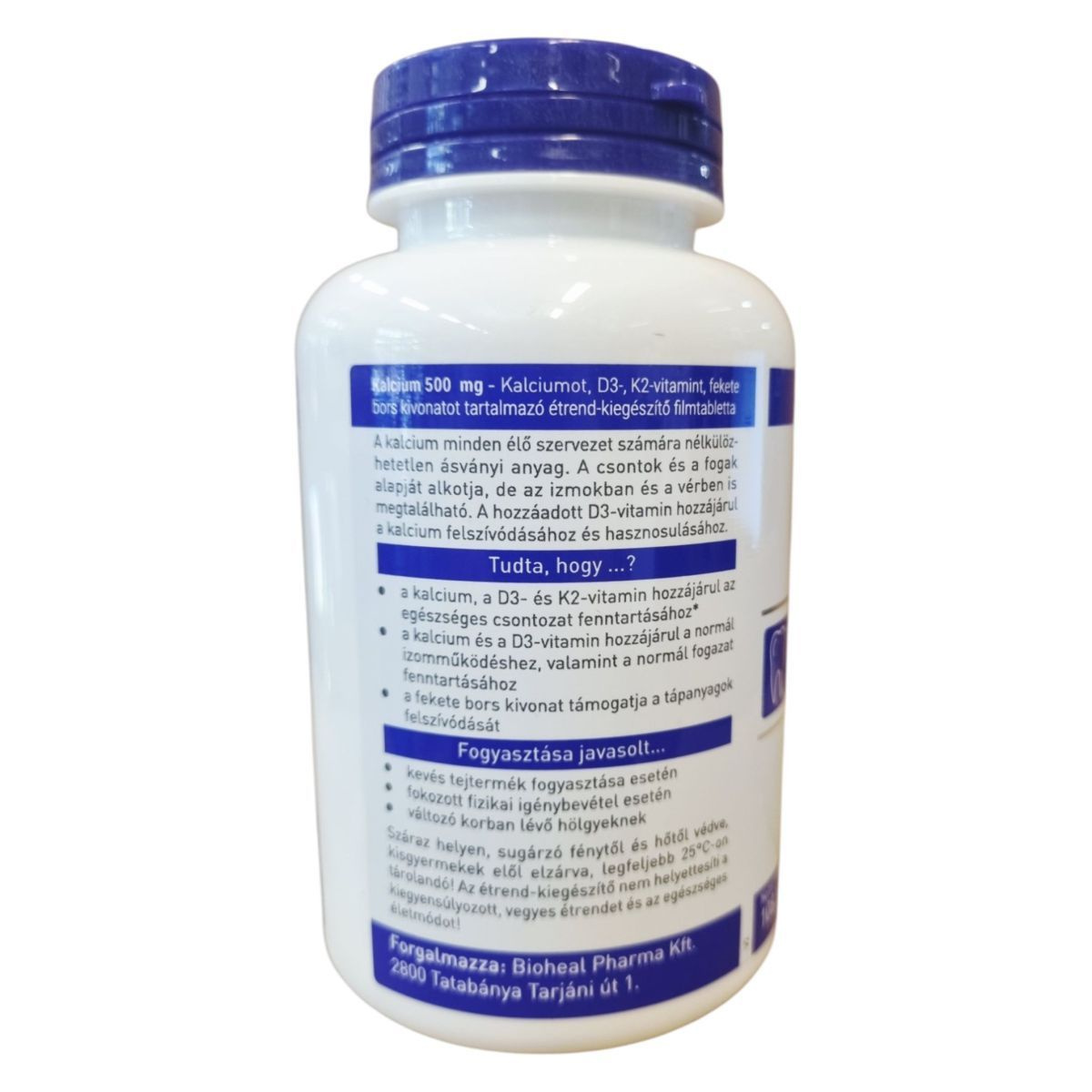 A Bioheal Kalcium 500 mg filmtabletta kalciumot, D3- és K2-vitamint, valamint fekete bors kivonatot tartalmaz, amelyek hozzájárulhatnak az egészséges csontozat fenntartásához, a normál izomműködéshez és a tápanyagok felszívódásához. Fogyasztása javasolt kevés tejtermék fogyasztása esetén, fokozott fizikai igénybevétel esetén, valamint változó korban lévő hölgyeknek. A termék minőségét megőrzi a doboz alján jelzett időpontig.