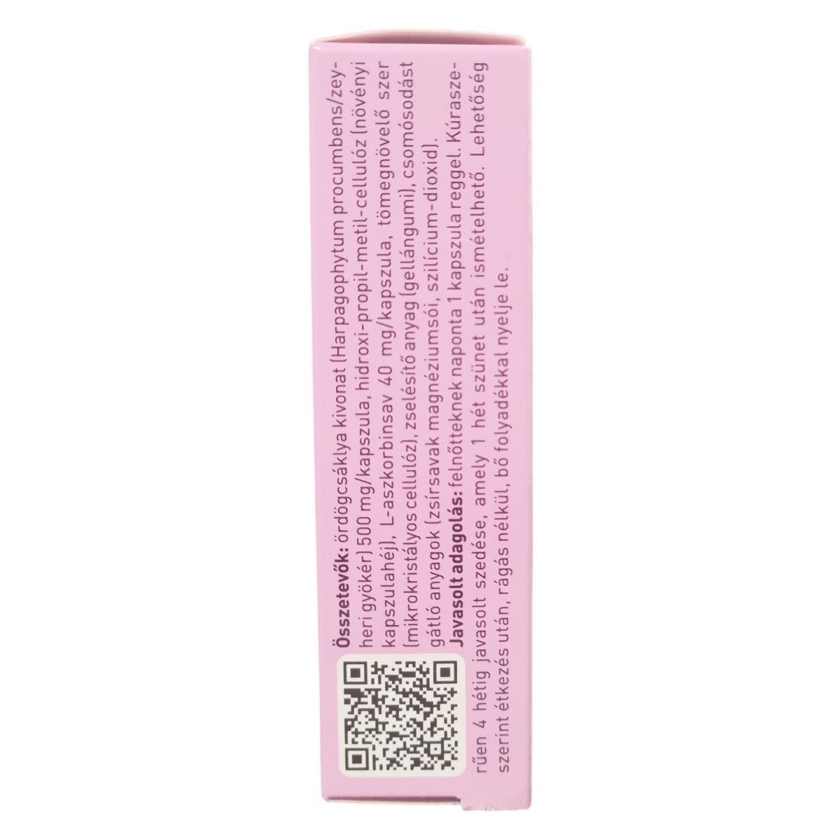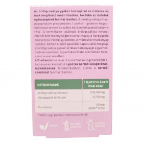 Az ördögcsáklya gyökere hozzájárulhat az ízületek és inak megfelelő mobilitásához, illetve az ízületek egészségének fenntartásához. A termékben található ördögcsáklya kivonat ellenőrzött mennyiségben tartalmazza a harpagozid elnevezésű iridoid-glikozidot. A speciális, bélben oldódó kapszulahéj megóvja az ördögcsáklya gyökér értékes hatóanyagát a gyomornedvvel szemben, ezáltal a hatóanyag jobban hasznosulhat a szervezetben. A C-vitamin hozzájárulhat a normál kollagénképződéshez, ezen keresztül a porcok normál állapotának és működésének, valamint a normál csontozat fenntartásához. A termék vegán, glutén- és laktózmentes, és hidroxi-propil-metil-cellulóz alapú növényi kapszulahéjjal készül. Kúraszerű alkalmazása javasolt a megfelelő hatás elérése érdekében.