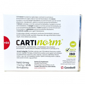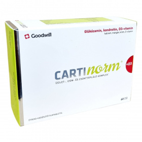 A CARTInorm olyan étrend-kiegészítő filmtabletta, amely glükózamint és kondroitint, valamint fontos vitaminokat és ásványi anyagokat egyesít az ízületek, izmok és csontok támogatására. A D-vitamin hozzájárulhat az egészséges csontozat és izomfunkció fenntartásához, illetve a kalcium normál felszívódásához. A C-vitamin segítheti a normál kollagén képződését, ami támogatja a porcok és csontok egészséges állapotát és működését. A kalcium mellett a mangán is hozzájárulhat a normál csontozat fenntartásához és a kötőszövet-képződéshez, míg a króm a normál vércukorszint fenntartásában játszhat szerepet. A glükózamin a porcok természetes alkotórésze, a kondroitin-szulfát pedig a porc egyik fő összetevője. A készítmény különösen ajánlott túlsúllyal küzdőknek, sportolóknak, folyamatos álló vagy nehéz fizikai munkát végzőknek és időskorúaknak, akik az ízületek, csontok és izomfunkciók támogatására keresnek segítséget. A készítmény folyamatos, minimum három hónapos alkalmazása javasolt, ügyelve a megfelelő, minimum 2 literes napi folyadékbevitelre.