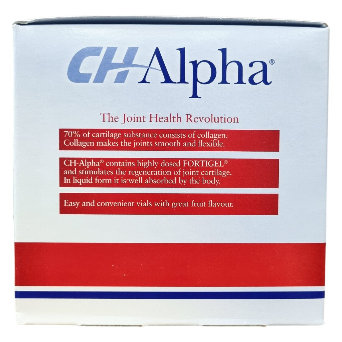 A CHAlpha® termék a FORTIGEL® hidrolizált kollagénpeptidet tartalmazza, amely a porcszövet egyik fő alkotóeleme. A készítmény kiváló felszívódású folyékony ampullákban kerül forgalomba, kellemes gyümölcsös ízesítéssel. A termék általánosan javasolt adagja egy ampulla naponta, a legjobb hatás eléréséhez legalább három hónapig folyamatosan javasolt a használata. Az ampullák használata egyszerű, előre adagolt mennyiséget biztosít, így nincs szükség keverésre vagy méricskélésre. A készítmény nem tartalmaz glutént és laktózt, allergének közül árpát tartalmaz. A termék pH-értéke 3,9–4,2 között mozog, sűrűsége pedig 1,145–1,165 g/ml.