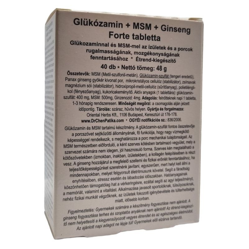 Kiszerelés: 40x1200mg. Ajánlott napi 1 tabletta szedése 1-3 hónapig rendszeresen. Gyermekek, véralvadásgátló gyógyszert szedők számára, várandós és szoptató anyukáknak, magas vérnyomásban szenvedőknek szedése nem ajánlott. Összetevők: MSM (Metil-szulfonil-metán), Glükózamin-szulfát (tengeri eredetű), Panax ginseng gyökér kivonat por (100mg / tabletta), stabilizátorok: (mikrokristályos cellulóz, magnézium-sztearát, hidroxi-propil-metil-cellulóz, polietilénglikol), kukoricakeményítő. Hatóanyagok a napi adagolásra: glükózamin: 280 mg, MSM: 500mg, ginsenozid: 4mg.