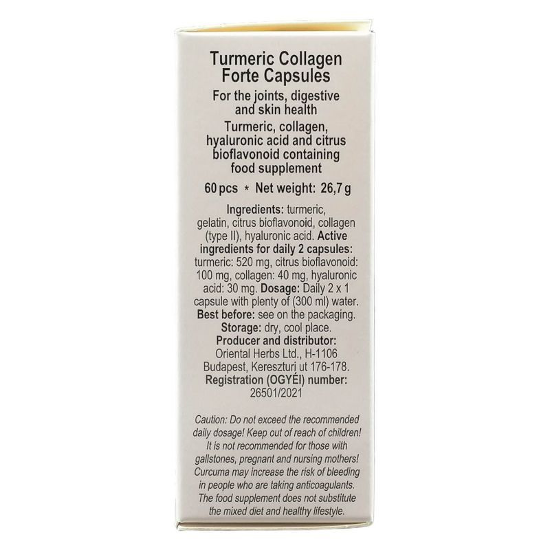 A kurkuma az indiai gasztronómia egyik leghíresebb gyöngyszeme, kedvező élettani hatása miatt népszerűsége egyre nagyobb. A kurkuma segít fenntartani az ízületek mozgathatóságát, egészséges működését. Antioxidánsként támogatja az immunrendszert, valamint a bőr egészségét. A kollagén az ízületekben és a bőrben természetesen is megtalálható rugalmas fehérje, a hyaluronsavval hozzájárulnak a bőr rugalmasságának megőrzéséhez. Támogassa bőrének jó állapotát, ízületeinek könnyű mozgathatóságát ezekkel az értékes hatóanyagokkal! Naponta: 2 × 1 kapszula szedése javasolt 3 deci vízzel bevéve.