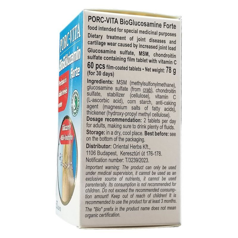 Glükozamin-MSM-kondroitin tartalmú étrend-kiegészítő tabletta. A porcok és a csontozat egészségéért C-vitaminnal. Ízületi terhelés következtében kialakuló porc-, valamint ízületi rendellenességek esetén. Kiszerelés: 1300 mg x 60 db. Adagolás (felhasználás): felnőttek számára naponta 2x1 tabletta, 1-3 hónapig kúraszerűen ügyelve a bőséges folyadék bevitelre.