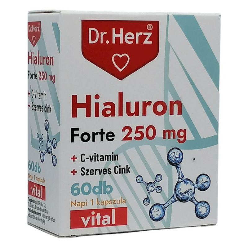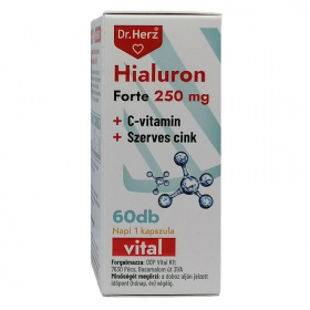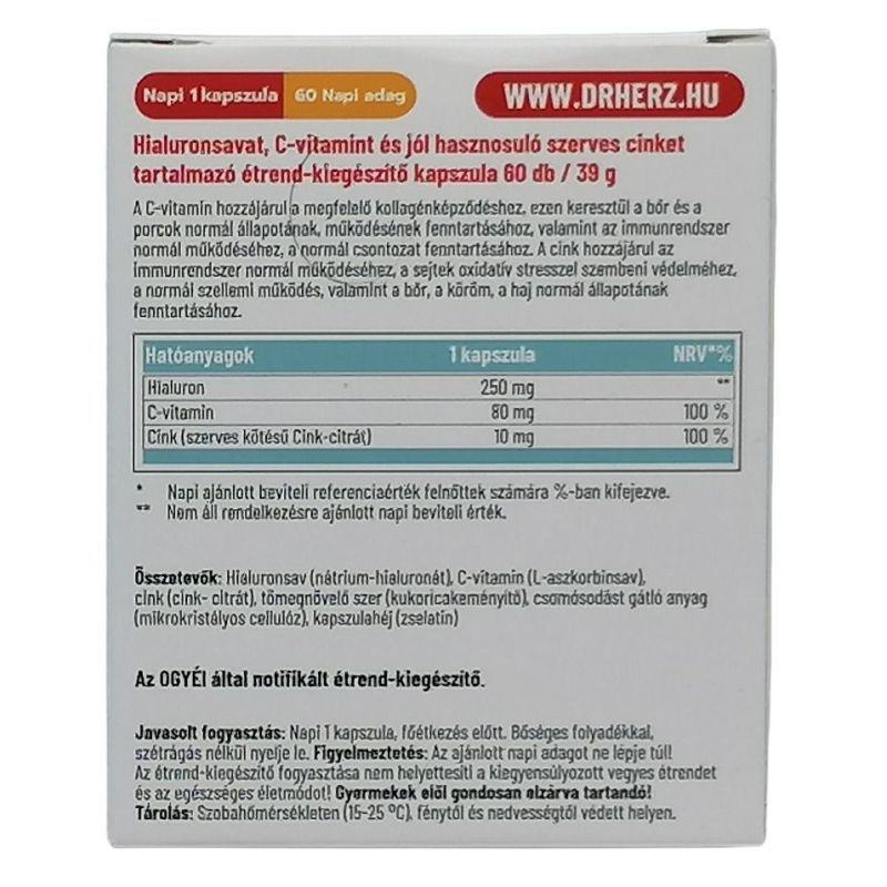 Hatóanyagok 1 kapszulában: hialuron 250mg, C-vitamin 80mg, cink (szerves kötésú Cink-ditrát) 10mg