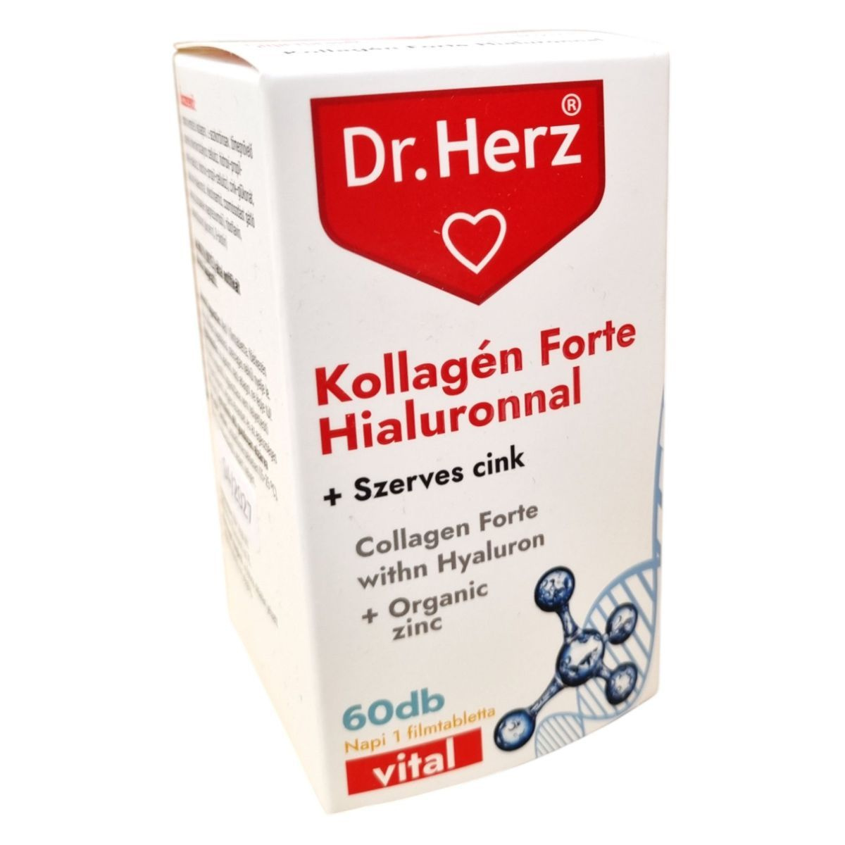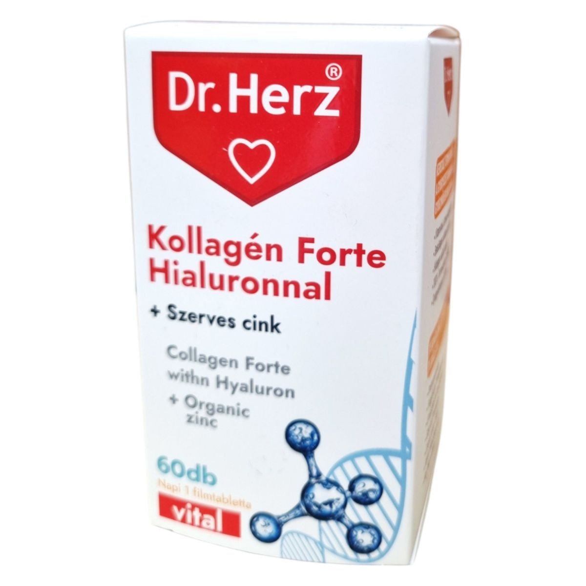 A Dr. Herz Kollagén Forte egy komplex étrend-kiegészítő, amely kollagént, hialuronsavat, szerves cinket, biotint, C-vitamint, riboflavint és niacint tartalmaz. Ezek az összetevők hozzájárulhatnak a bőr, haj és köröm egészségének támogatásához, valamint az immunrendszer erősítéséhez. A termék napi egy filmtabletta formájában fogyasztható, amelyet főétkezés után, bőséges folyadékkal ajánlott bevenni. A termék bio étrendi irányzatba sorolható, és az OGYÉI által notifikált. Tárolása szobahőmérsékleten, fénytől és nedvességtől védett helyen javasolt.