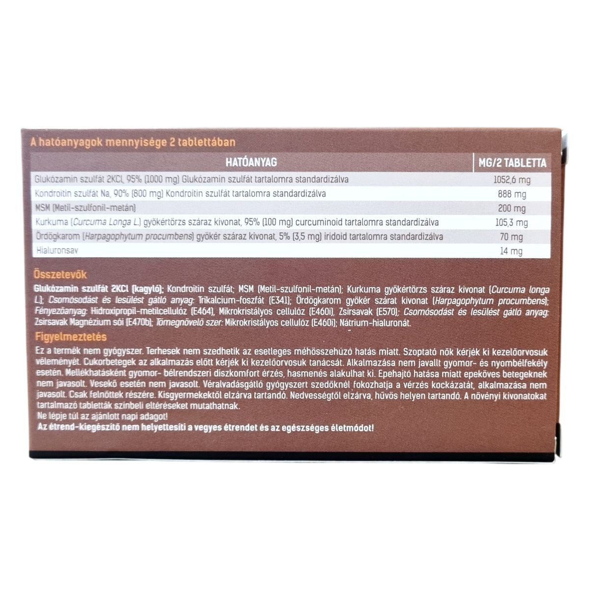 Glukózamin szulfát 2KCl (kagyló), Kondroitin szulfát, MSM (Metil-szulfonil-metan), Kurkuma gyökértörzs száraz kivonat (Curcuma longa L.), Trikalcium-foszfát (E341), Ördögkarom gyökér száraz kivonat (Harpagophytum procumbens), Hidroxipropil-metilcellulóz (E464), Mikrokristályos cellulóz (E460i), Zsírsavak (E570), Zsírsavak Magnézium sói (E470b), Mikrokristályos cellulóz (E460i), Nátrium-hialuronát