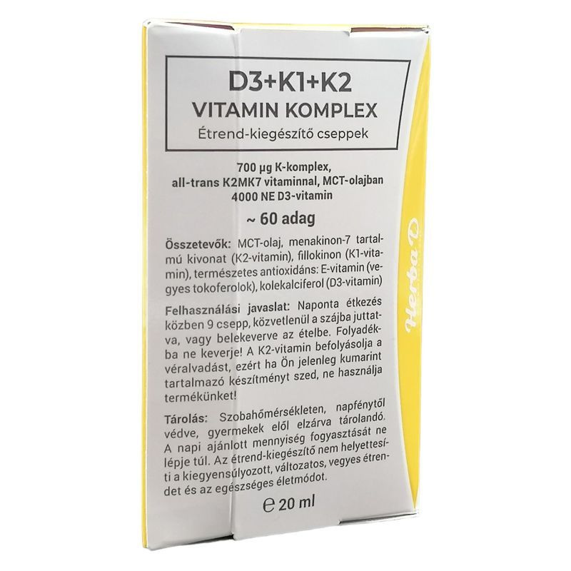 Összetevők: MCT olaj, menakinon-7 tartalmú kivonat (K2-vitamin), kolekalciferol (D3-vitamin) fillokinon (K1 vitamin), természetes antioxidáns: E-vitamin (vegyes tokoferolok).