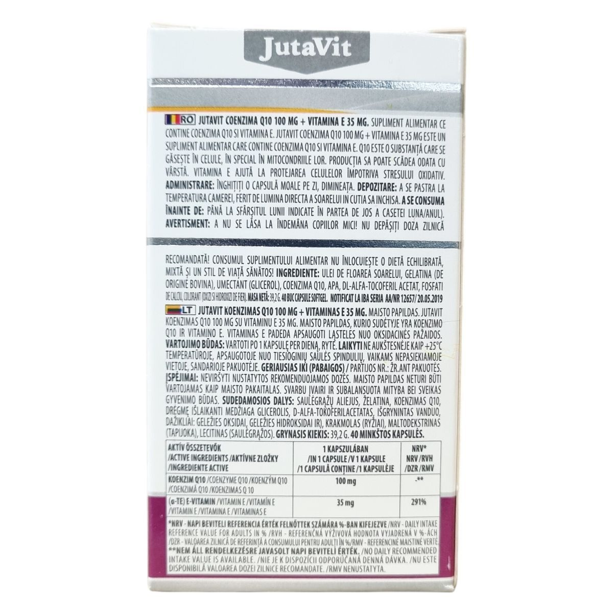 A JutaVit Koenzim Q10 100 mg + E-vitamin 35 mg lágyzselatin kapszulák koenzim Q10-et, valamint E-vitamint tartalmazó étrend-kiegészítők, melyek a sejtek mitokondriumában található anyagot pótolják. A koenzim Q10 termelődése az életkor előrehaladtával csökkenhet, míg az E-vitamin hozzájárulhat a sejtek oxidatív stresz elleni védelméhez. A készítmény napraforgóolajban diszpergált, állati eredetű zselatin kapszula formájában kerül forgalomba. A terméknek nincs meghatározott napi beviteli referencia értéke felnőttek számára. A kapszulák javasolt adagolása napi egy, amelyet reggel, egészben kell lenyelni, vízzel leöblítve. Fontos a termék gyermekektől való távol tartása, valamint, hogy az étrend-kiegészítő nem helyettesíti a változatos étrendet és az egészséges életmódot. A terméket szobahőmérsékleten, fénytől védve, az eredeti csomagolásban kell tárolni.