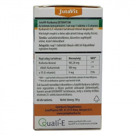Hozzájárul az ízületek rugalmasságához. Segít fenntartani a csontok, ízületek egészségét. E-vitamin hozzájárul a sejtek oxidatív stresszel szembeni védelméhez. Adagolás: napi 1 tablettát étkezés előtt bő folyadékkal egészben lenyelni. Sok hasonló termékkel ellentétben a JutaVit Kurkuma tabletta nem egyszerűen a fűszer porított változatát (őrleményét), hanem annak KIVONATÁT tartalmazza, mely a növény értékes részének 50-szeres koncentrátuma.