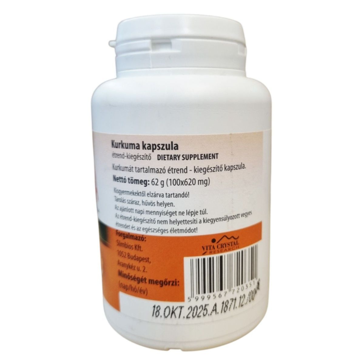 A VITA CRYSTAL RESEARCH Kurkuma kapszula egy étrend-kiegészítő, amely kurkumát tartalmaz. A termék 100 kapszulát tartalmaz, és nettó tömege 62 g. A kurkuma hagyományosan ismert lehet gyulladáscsökkentő tulajdonságairól, és hozzájárulhat az általános egészségi állapot fenntartásához. A termék forgalmazója a Slimbios Kft., és a kapszulák HPMC alapúak, amelyek hipromellózt, cink-oxidot, sűrítőanyagot és emulgeálószert tartalmaznak. A termék használata előtt különösen fontos, hogy bizonyos egészségügyi állapotok esetén konzultáljon orvosával.