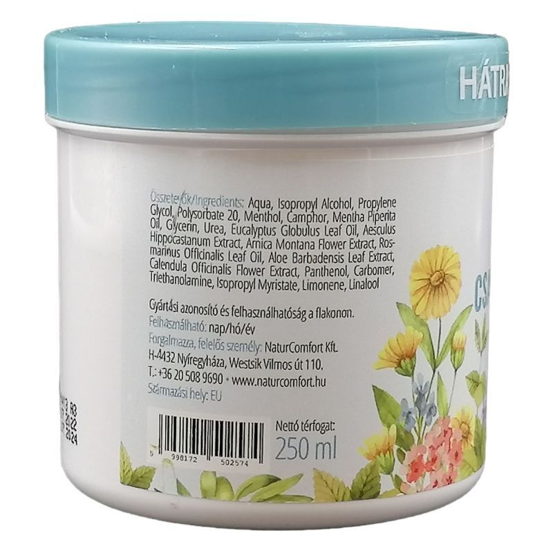Összetevők: vadgesztenye, árnika, aloe vera, menta, kámfor, rozmaring, körömvirág, shea-vaj, olívaolaj, avokádóolaj, kókuszolaj. A készítmény nem tartalmaz mesterséges színezéket, sem kémiai vegyszereket, ezért nem terheli meg a szervezetet.
