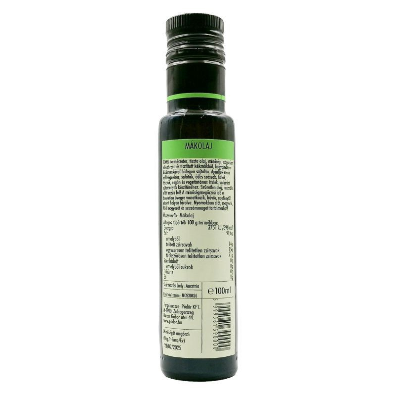 A mákolaj a mák hideg sajtolásával készül, így megőrzi a mag jótékony összetevőit. Gazdag omega-3 és omega-6 zsírsavakban, amelyek hozzájárulnak a szív és az érrendszer egészségéhez. Az olaj különleges ízével feldobja a salátákat, zöldségeket, húsételeket és pörkölteket, így az étkezések élvezetesebbé válnak. Az antioxidánsokban gazdag mákolaj segít megvédeni a sejteket a káros hatásoktól.