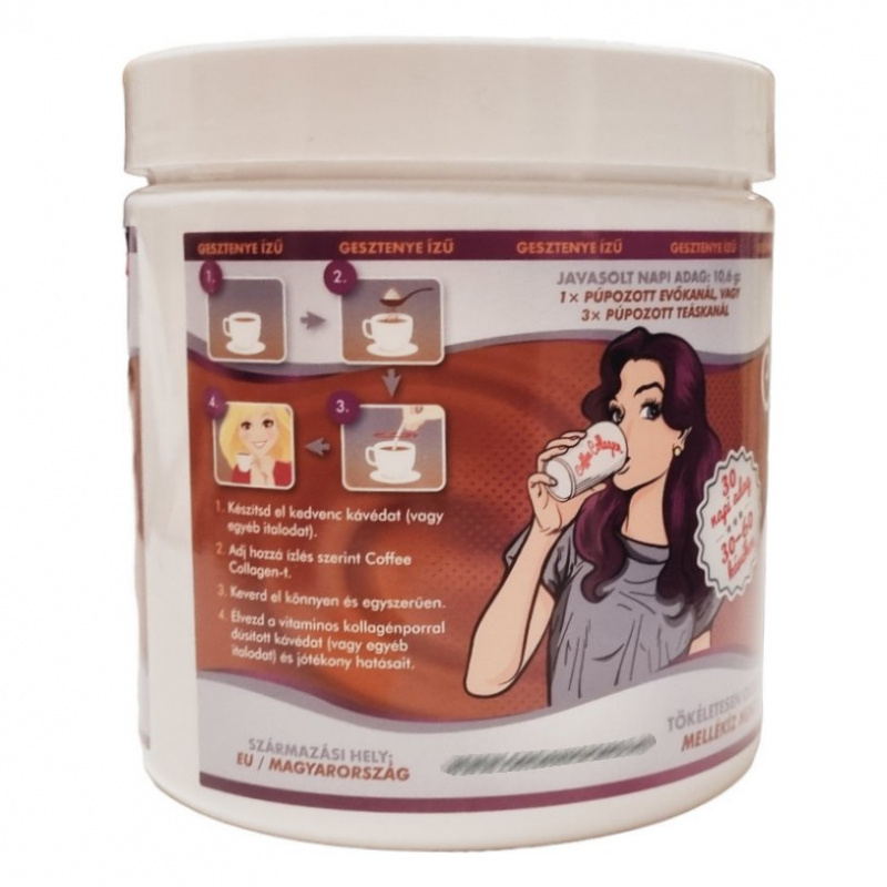 Adagolás: napi 1 púpozott evőkanál (10,5 g) vagy 3 púpozott teáskanál. llleszd be kávézási szokásaidba: a napi adagot megihatod 1 kávéban vagy ha többször kávézol, szét is oszthatod a nap folyamán. 1. készítsd el a kedvenc kávédat vagy egyéb italodat, 2. adj hozzá ízlés szerint Coffee Collagént. 3. keverd el könnyen és egyszerűen. 4. élvezd a vitaminos kollagénporral dúsított kávédat (vagy egyéb italodat, turmix, kakaó) és jótékony hatásait. A bevitt kollagén maximális mértékű hasznosulásához vigyél be rendszeresen C- vitamint a szervezetedbe akár táplálék, akár vitamin formájában.