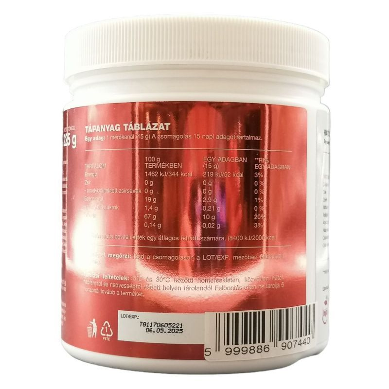 A fehérje hozzájárul az izomtömeg növekedéséhez és fenntartásához és a normál csontozat fenntartásához. A cink és a szelén hozzájárul a haj és a köröm normál állapotának fenntartásához. Összetevők: Kollagén (marhából), Maltodextrin, Étkezési sav (citromsav), Csomósodást gátló anyagok (Szilícium-dioxid, Kalcium-foszfátok), Aromák, Acai bogyó (Euterpe oleracea) kivonat, Hialuronsav, Édesítőszerek (Aceszulfám-K, Szukralóz), L-aszkorbinsav, Csipkebogyó (Rosa canina) por, Cékla kivonat, Cink-citrát, Étkezési só, Színezék (Ponszó 4R*), Nátrium-szelenit. *Ponszó 4R - A gyermekek tevékenységére és figyelmére káros hatást gyakorolhat. TÁPANYAG TÁBLÁZAT Egy adag: 1 mérőkanál (15 g) A csomagolás 15 napi adagot tartalmaz. 100 g termékben Egy adagban (15 g) **RI% egy adagban Energia 1462 kJ/ 344 kcal 219 kJ/ 52 kcal 3 % Zsír 0 g 0 g 0 % - amelyből telített zsírsavak 0 g 0 g 0 % Szénhidrát 19 g 2,9 g 1 % - amelyből cukrok 1,4 g 0,21 g 0 % Fehérje 67 g 10 g 20 % Só 0,14 g 0,02 g 3 % **RI: Referencia beviteli érték egy átlagos felnőtt számára. (8400 kJ/2000 kcal). HATÓANYAG TÁBLÁZAT Egy adag: 1 mérőkanál (15 g) A csomagolás 15 napi adagot tartalmaz. 100 g termékben Egy adagban (15 g) C-vitamin 600 mg 90 mg (112% NRV***) Cink 73 mg 11 mg (110% NRV***) Szelén 733 µg 110 µg (200% NRV***) Nátrium 54 mg 8,1 mg Kollagén 67000 mg 10000 mg Acai bogyó (Euterpe oleracea) kivonat 1000 mg 150 mg Hilauronsav 833 mg 125 mg Csipkebogyó (Rosa canina) gyümölcspor 333 mg 50 mg Cékla kivonat 300 mg 45 mg ***NRV: Napi beviteli referenciaérték %-a egy átlagos felnőtt számára. Felhasználási javaslat: Keverjen el egy adag (15 g) kollagén port 250 ml hideg vízzel és fogyassza a nap folyamán. Figyelmeztetés: A termék kisgyermek elől elzárva tárolandó! A termék nem helyettesíti a kiegyensúlyozott étrendet és az egészséges életmódot! Az ajánlott napi fogyasztási mennyiséget ne lépje túl! Tárolási feltételek: 5°C és 30°C közötti hőmérsékleten, közvetlen hőtől, napfénytől és nedvességtől védett helyen tárolandó! Felbontás után ne tárolja 6 hónapnál tovább a terméket.